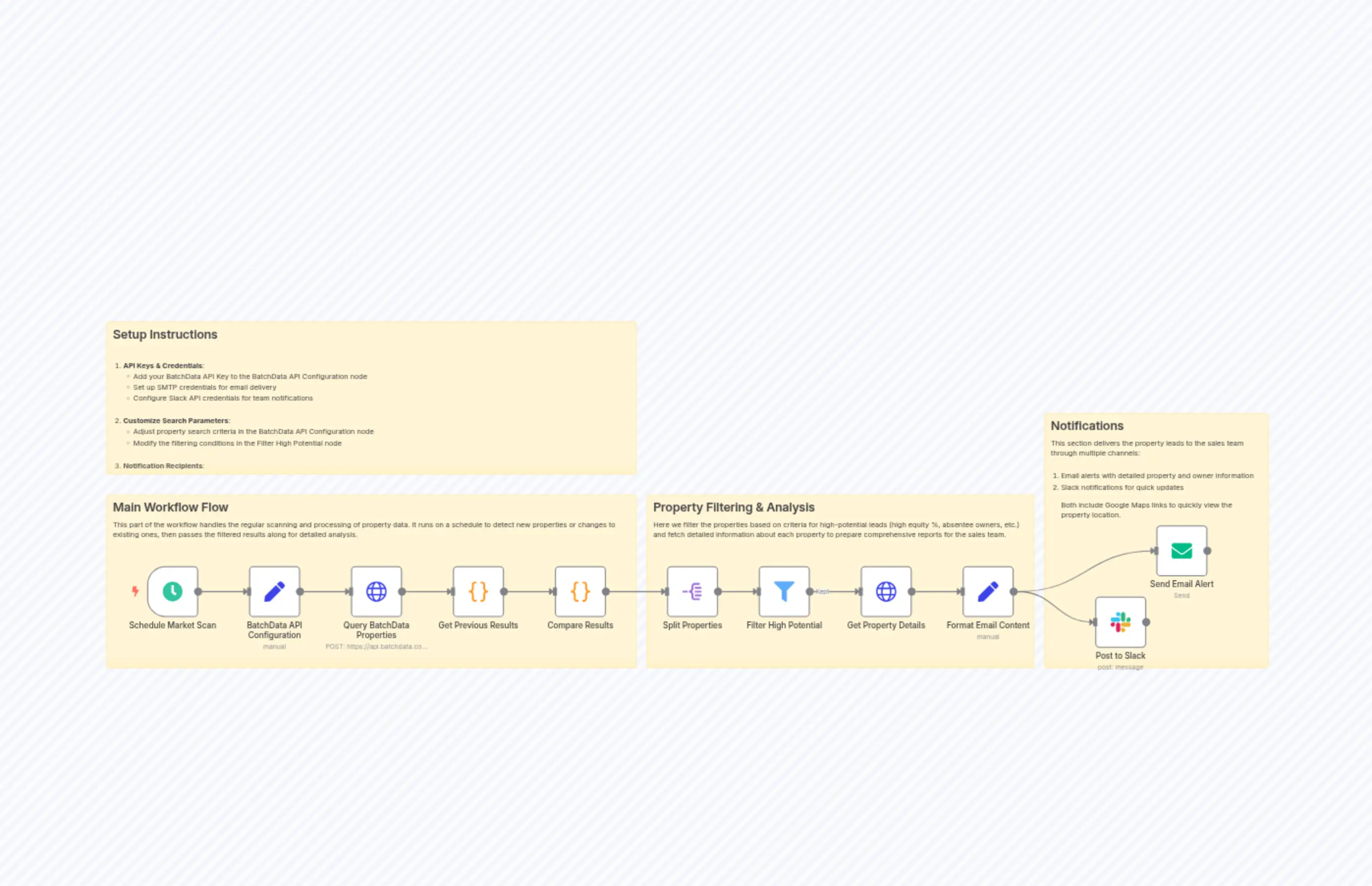 "content": "## Setup Instructions\n\n1. **API Keys & Credentials**:\n - Add your BatchData API Key to the BatchData API Configuration node\n - Set up SMTP credentials for email delivery\n - Configure Slack API credentials for team notifications\n\n2. **Customize Search Parameters**:\n - Adjust property search criteria in the BatchData API Configuration node\n - Modify the filtering conditions in the Filter High Potential node\n\n3. **Notification Recipients**:\n - Update email recipients in the Send Email Alert node\n - Set appropriate Slack channel in the Post to Slack node"