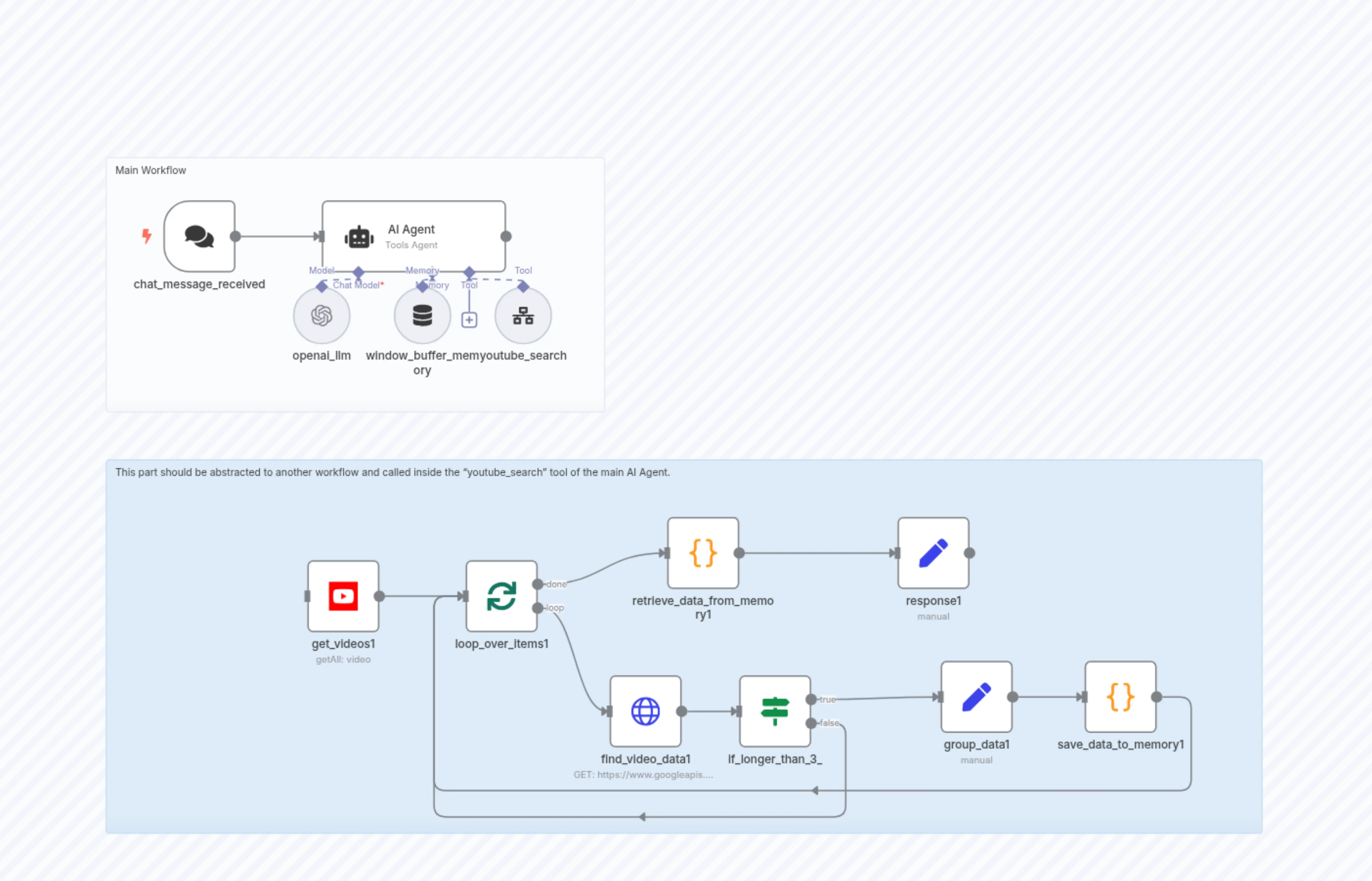 "content": "This part should be abstracted to another workflow and called inside the \"youtube_search\" tool of the main AI Agent."