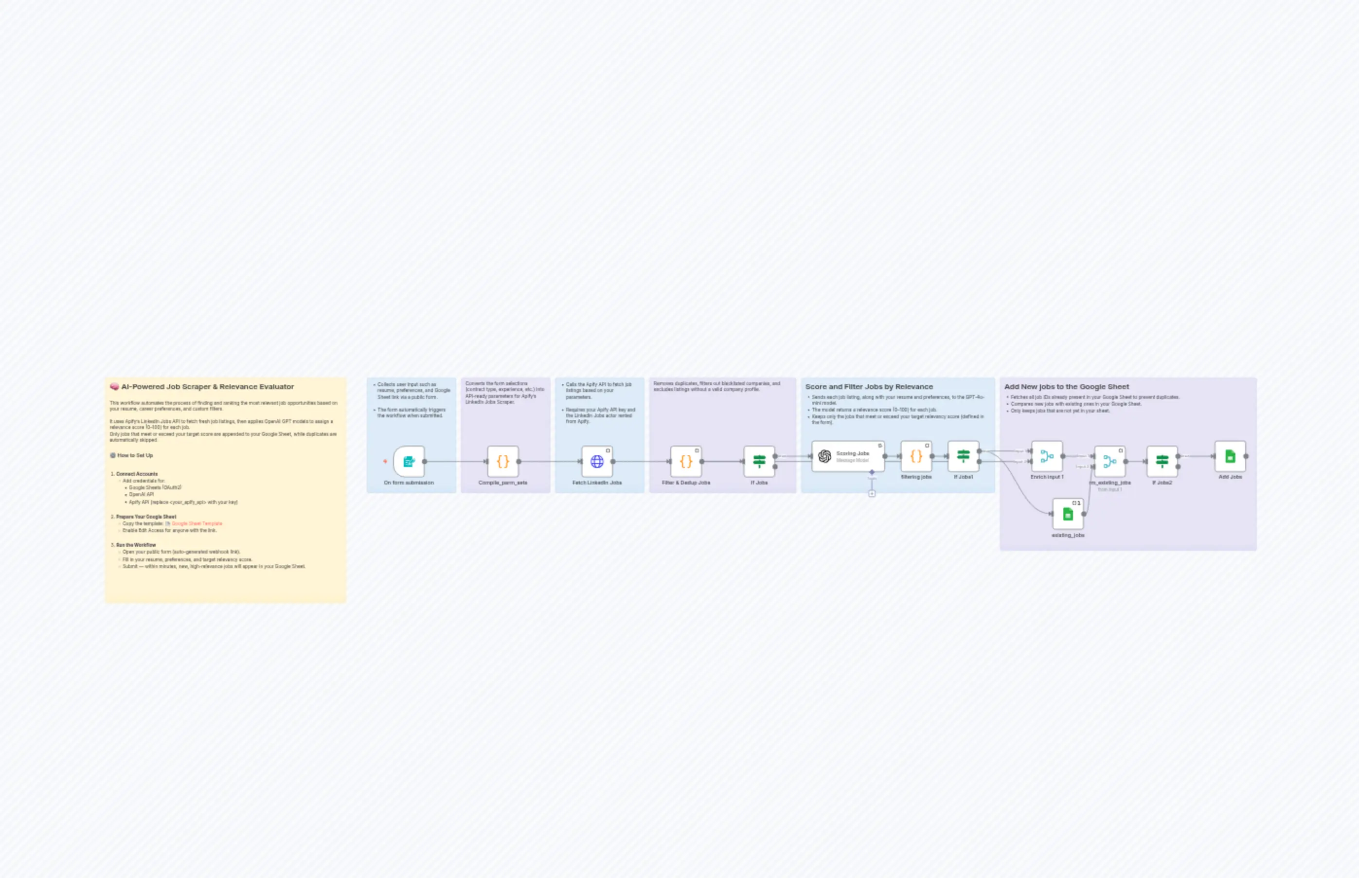 "content": "## 🧠 AI-Powered Job Scraper & Relevance Evaluator\n\nThis workflow automates the process of finding and ranking the most relevant job opportunities based on your resume, career preferences, and custom filters.\n\nIt uses Apify’s LinkedIn Jobs API to fetch fresh job listings, then applies OpenAI GPT models to assign a relevance score (0–100) for each job.\nOnly jobs that meet or exceed your target score are appended to your Google Sheet, while duplicates are automatically skipped.\n\n### ⚙️ How to Set Up\n\n1. **Connect Accounts**\n * Add credentials for:\n * Google Sheets (OAuth2)\n * OpenAI API\n * Apify API (replace <your_apify_api> with your key)\n\n2. **Prepare Your Google Sheet**\n * Copy the template: 📄 [Google Sheet Template](https://docs.google.com/spreadsheets/d/1Pabh4GDMc0CBK5S6gn8FxpRgLbyXZVN656JNkBH6f7Y/edit?gid=0#gid=0)\n * Enable Edit Access for anyone with the link.\n\n3. **Run the Workflow**\n * Open your public form (auto-generated webhook link).\n * Fill in your resume, preferences, and target relevancy score.\n * Submit — within minutes, new, high-relevance jobs will appear in your Google Sheet."