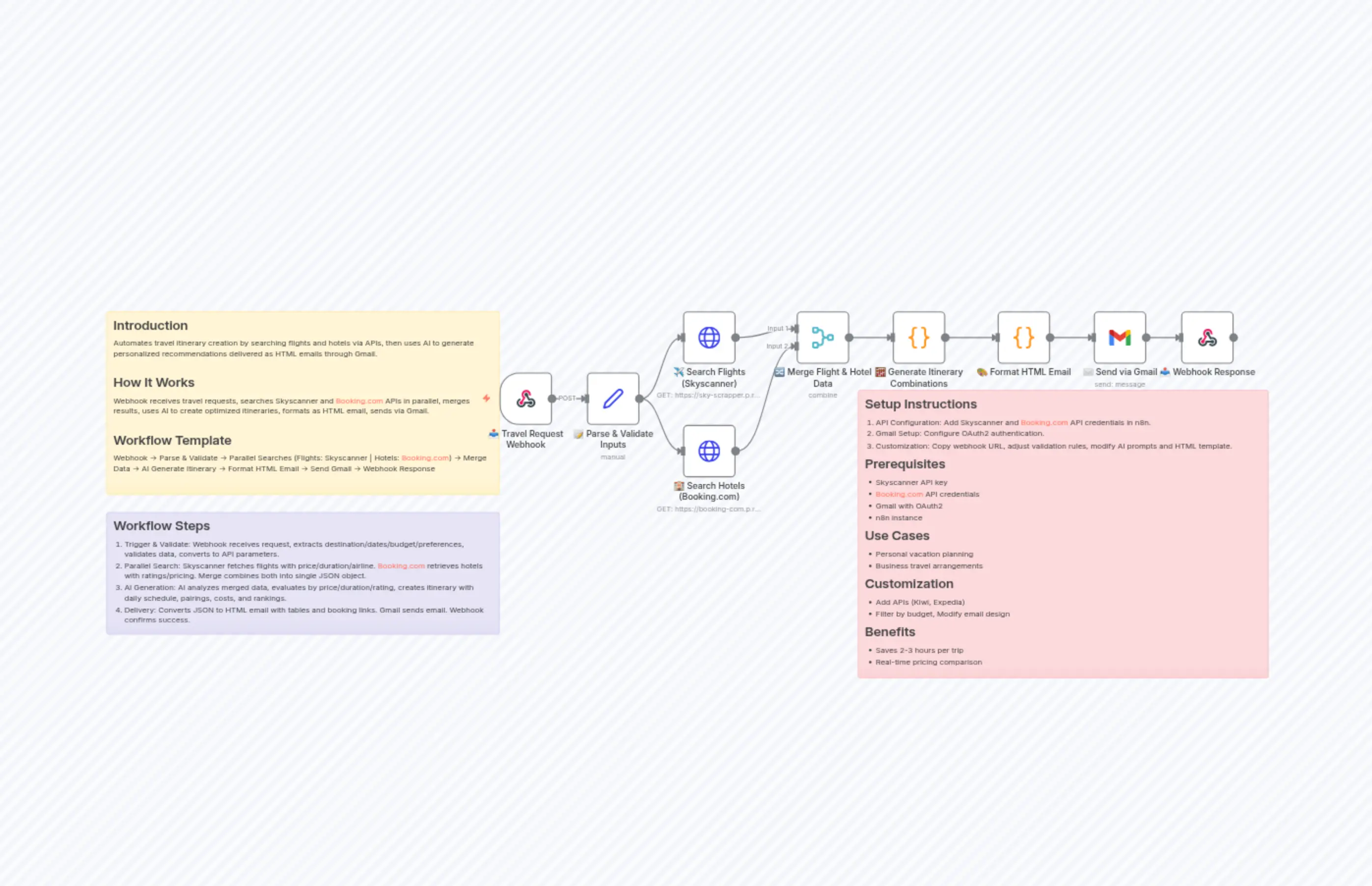 "content": "## Introduction\nAutomates travel itinerary creation by searching flights and hotels via APIs, then uses AI to generate personalized recommendations delivered as HTML emails through Gmail.\n\n## How It Works\nWebhook receives travel requests, searches Skyscanner and Booking.com APIs in parallel, merges results, uses AI to create optimized itineraries, formats as HTML email, sends via Gmail.\n\n## Workflow Template\nWebhook → Parse & Validate → Parallel Searches (Flights: Skyscanner | Hotels: Booking.com) → Merge Data → AI Generate Itinerary → Format HTML Email → Send Gmail → Webhook Response\n\n\n\n"
