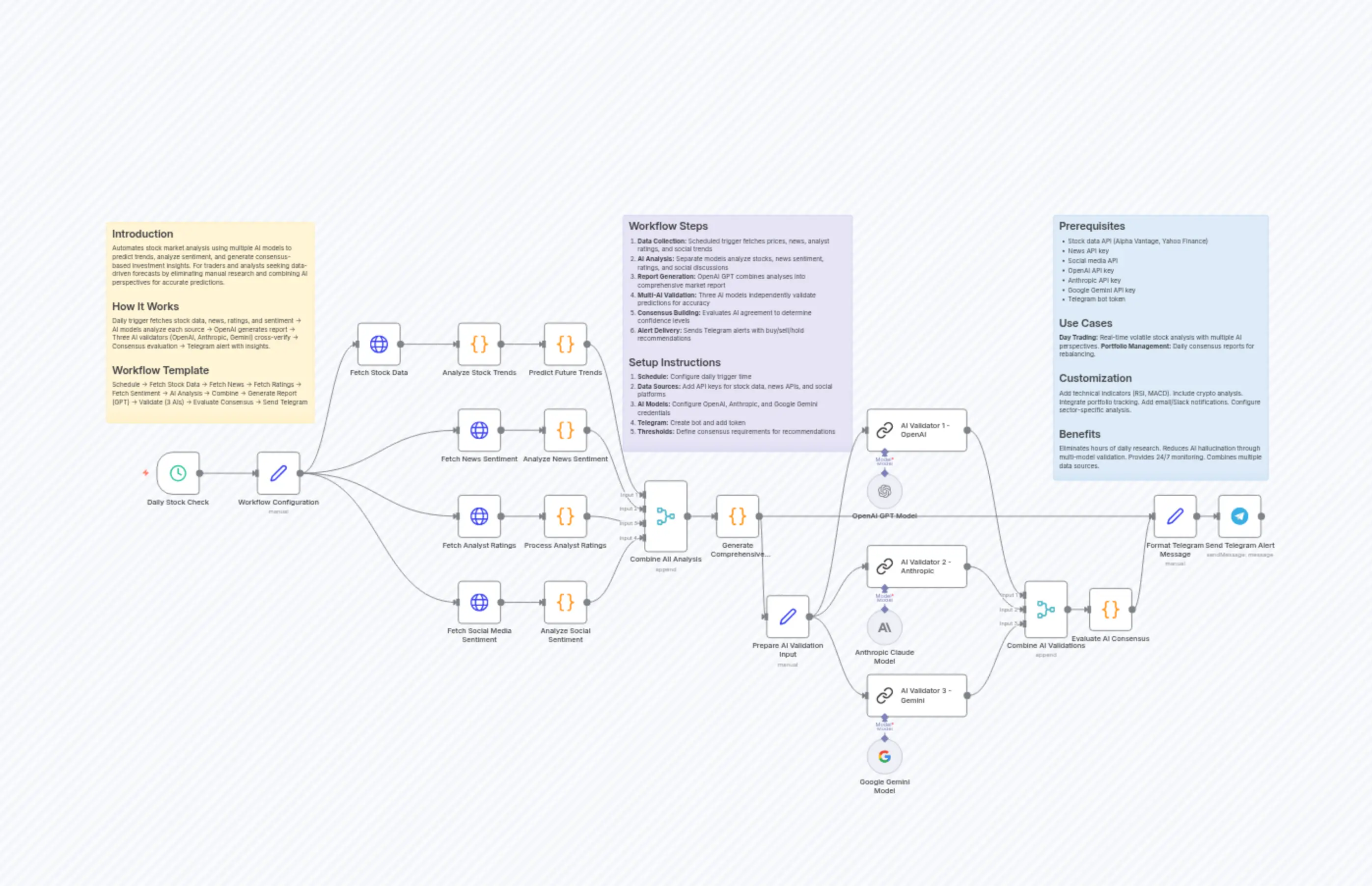 "content": "## Workflow Steps\n1. **Data Collection:** Scheduled trigger fetches prices, news, analyst ratings, and social trends\n2. **AI Analysis:** Separate models analyze stocks, news sentiment, ratings, and social discussions\n3. **Report Generation:** OpenAI GPT combines analyses into comprehensive market report\n4. **Multi-AI Validation:** Three AI models independently validate predictions for accuracy\n5. **Consensus Building:** Evaluates AI agreement to determine confidence levels\n6. **Alert Delivery:** Sends Telegram alerts with buy/sell/hold recommendations\n\n## Setup Instructions\n1. **Schedule:** Configure daily trigger time\n2. **Data Sources:** Add API keys for stock data, news APIs, and social platforms\n3. **AI Models:** Configure OpenAI, Anthropic, and Google Gemini credentials\n4. **Telegram:** Create bot and add token\n5. **Thresholds:** Define consensus requirements for recommendations"