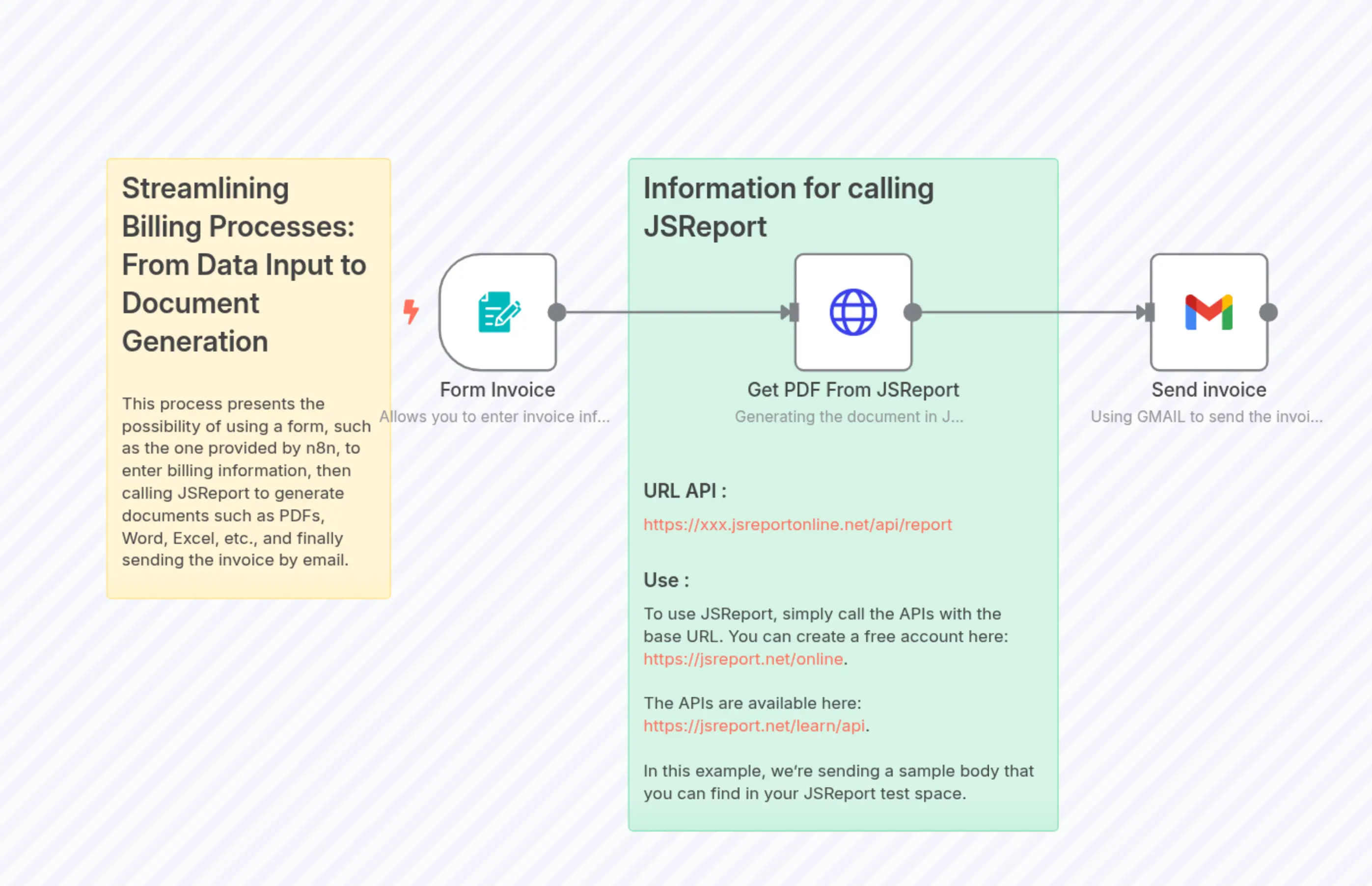 "content": "## Streamlining Billing Processes: From Data Input to Document Generation\n\nThis process presents the possibility of using a form, such as the one provided by n8n, to enter billing information, then calling JSReport to generate documents such as PDFs, Word, Excel, etc., and finally sending the invoice by email.\n"