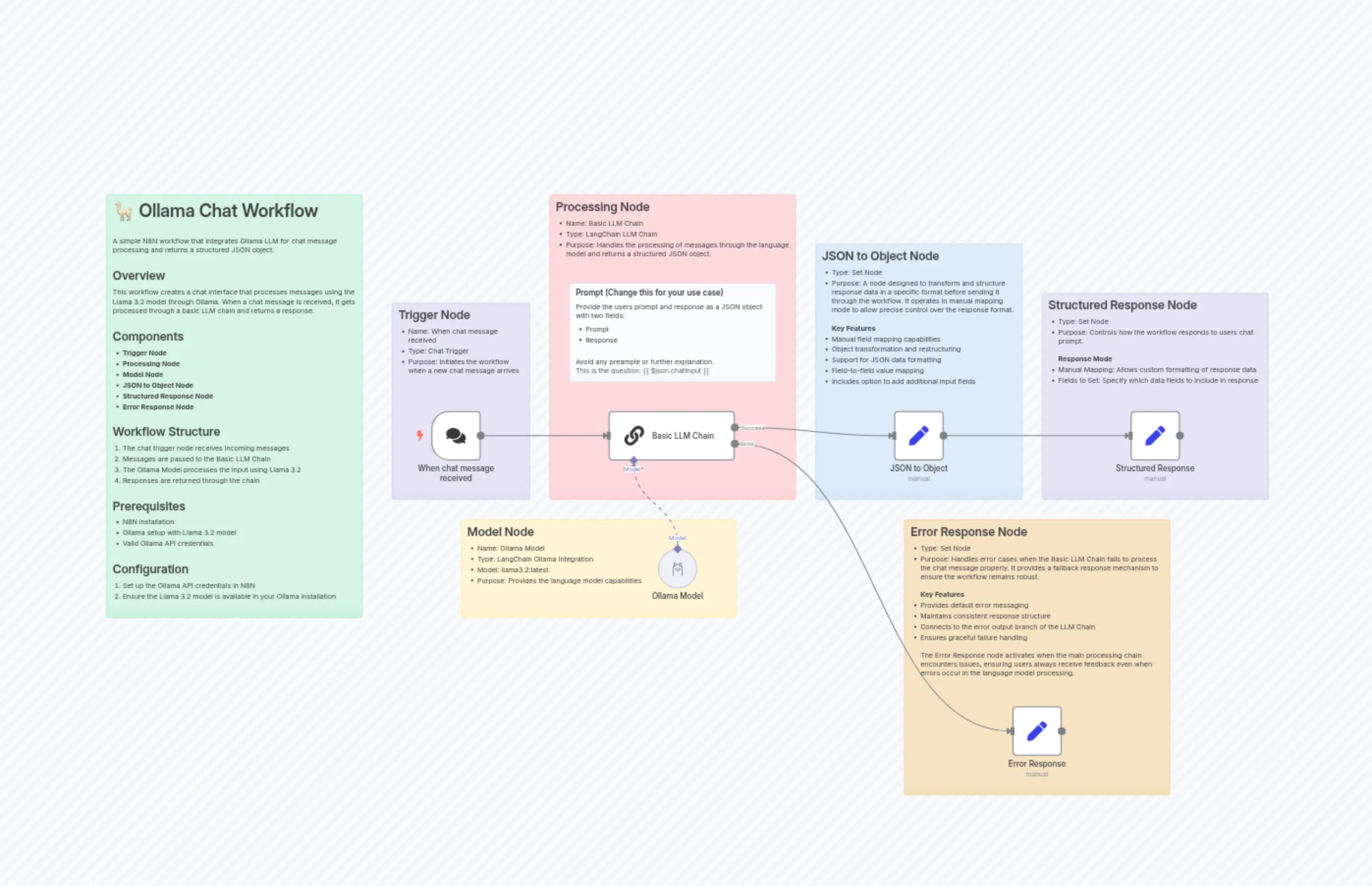 "content": "# 🦙 Ollama Chat Workflow\n\nA simple N8N workflow that integrates Ollama LLM for chat message processing and returns a structured JSON object.\n\n## Overview\nThis workflow creates a chat interface that processes messages using the Llama 3.2 model through Ollama. When a chat message is received, it gets processed through a basic LLM chain and returns a response.\n\n## Components\n- **Trigger Node**\n- **Processing Node**\n- **Model Node**\n- **JSON to Object Node**\n- **Structured Response Node**\n- **Error Response Node**\n\n## Workflow Structure\n1. The chat trigger node receives incoming messages\n2. Messages are passed to the Basic LLM Chain\n3. The Ollama Model processes the input using Llama 3.2\n4. Responses are returned through the chain\n\n## Prerequisites\n- N8N installation\n- Ollama setup with Llama 3.2 model\n- Valid Ollama API credentials\n\n## Configuration\n1. Set up the Ollama API credentials in N8N\n2. Ensure the Llama 3.2 model is available in your Ollama installation\n\n"