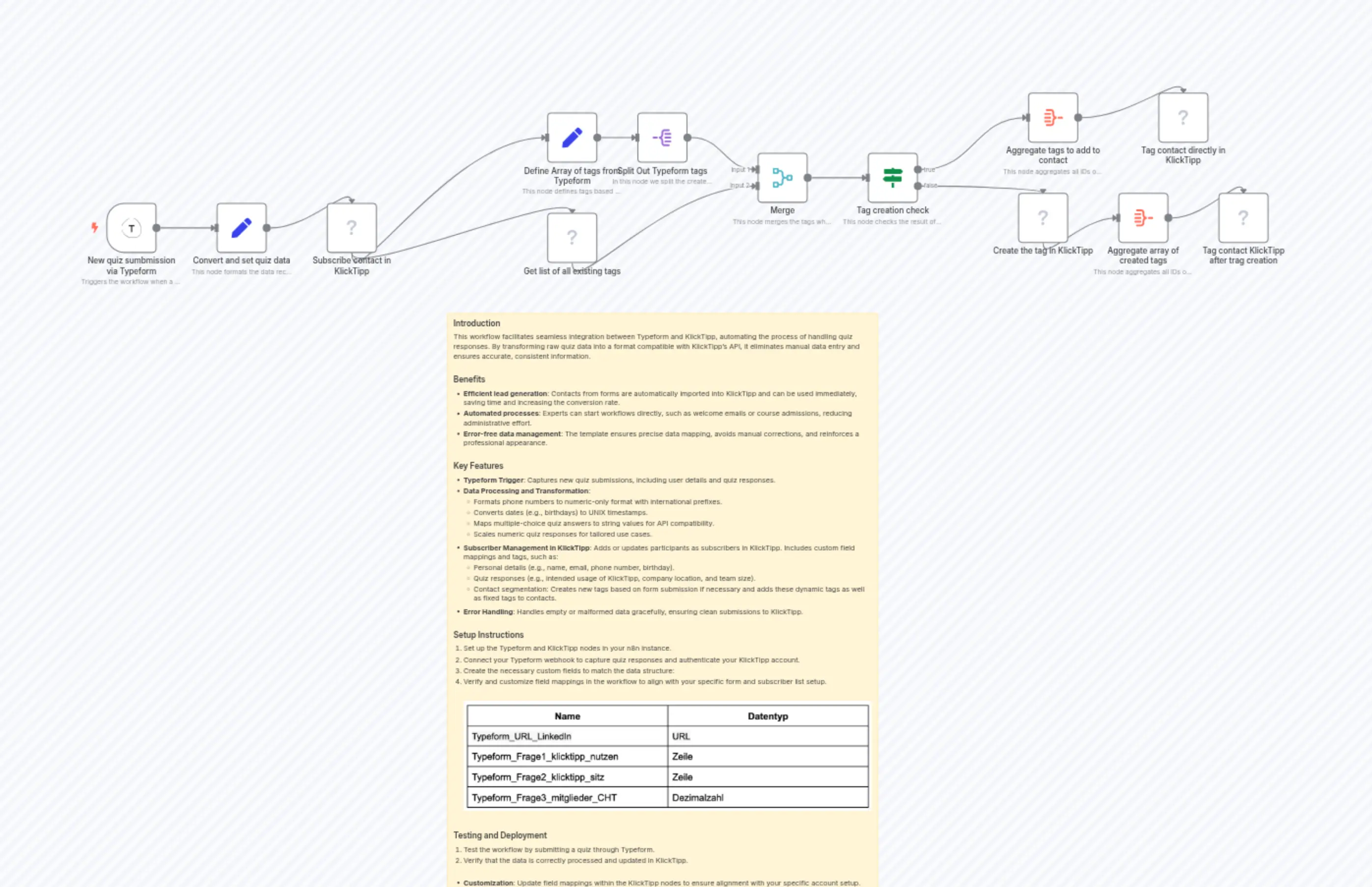 "content": "### Introduction\nThis workflow facilitates seamless integration between Typeform and KlickTipp, automating the process of handling quiz responses. By transforming raw quiz data into a format compatible with KlickTipp’s API, it eliminates manual data entry and ensures accurate, consistent information. \n\n### Benefits\n- **Efficient lead generation**: Contacts from forms are automatically imported into KlickTipp and can be used immediately, saving time and increasing the conversion rate.\n- **Automated processes**: Experts can start workflows directly, such as welcome emails or course admissions, reducing administrative effort.\n- **Error-free data management**: The template ensures precise data mapping, avoids manual corrections, and reinforces a professional appearance.\n\n### Key Features\n- **Typeform Trigger**: Captures new quiz submissions, including user details and quiz responses.\n- **Data Processing and Transformation**:\n - Formats phone numbers to numeric-only format with international prefixes.\n - Converts dates (e.g., birthdays) to UNIX timestamps.\n - Maps multiple-choice quiz answers to string values for API compatibility.\n - Scales numeric quiz responses for tailored use cases.\n- **Subscriber Management in KlickTipp**: Adds or updates participants as subscribers in KlickTipp. Includes custom field mappings and tags, such as:\n - Personal details (e.g., name, email, phone number, birthday).\n - Quiz responses (e.g., intended usage of KlickTipp, company location, and team size).\n - Contact segmentation: Creates new tags based on form submission if necessary and adds these dynamic tags as well as fixed tags to contacts.\n- **Error Handling**: Handles empty or malformed data gracefully, ensuring clean submissions to KlickTipp.\n\n### Setup Instructions\n1. Set up the Typeform and KlickTipp nodes in your n8n instance.\n2. Connect your Typeform webhook to capture quiz responses and authenticate your KlickTipp account.\n3. Create the necessary custom fields to match the data structure:\n4. Verify and customize field mappings in the workflow to align with your specific form and subscriber list setup.\n\n\n\n### Testing and Deployment\n1. Test the workflow by submitting a quiz through Typeform.\n2. Verify that the data is correctly processed and updated in KlickTipp.\n\n- **Customization**: Update field mappings within the KlickTipp nodes to ensure alignment with your specific account setup. "