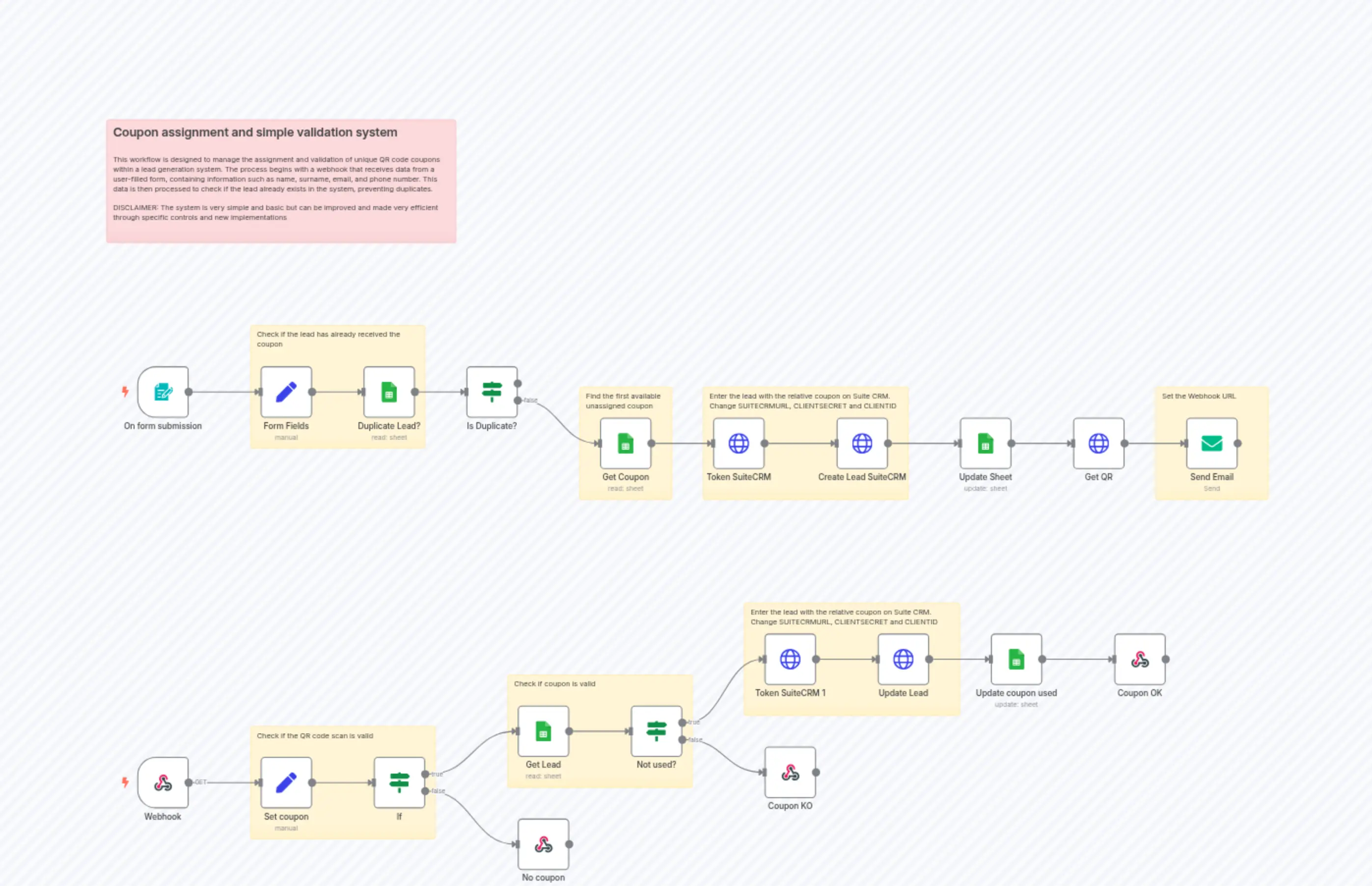 "content": "## Coupon assignment and simple validation system\n\nThis workflow is designed to manage the assignment and validation of unique QR code coupons within a lead generation system. The process begins with a webhook that receives data from a user-filled form, containing information such as name, surname, email, and phone number. This data is then processed to check if the lead already exists in the system, preventing duplicates.\n\nDISCLAIMER: The system is very simple and basic but can be improved and made very efficient through specific controls and new implementations"