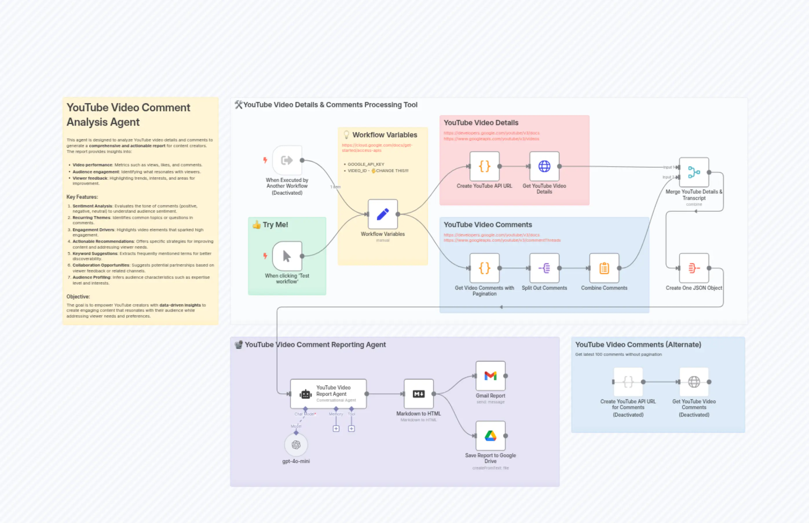 "content": "# YouTube Video Comment Analysis Agent\n\nThis agent is designed to analyze YouTube video details and comments to generate a **comprehensive and actionable report** for content creators. The report provides insights into:\n\n- **Video performance**: Metrics such as views, likes, and comments.\n- **Audience engagement**: Identifying what resonates with viewers.\n- **Viewer feedback**: Highlighting trends, interests, and areas for improvement.\n\n### Key Features:\n1. **Sentiment Analysis**: Evaluates the tone of comments (positive, negative, neutral) to understand audience sentiment.\n2. **Recurring Themes**: Identifies common topics or questions in comments.\n3. **Engagement Drivers**: Highlights video elements that sparked high engagement.\n4. **Actionable Recommendations**: Offers specific strategies for improving content and addressing viewer needs.\n5. **Keyword Suggestions**: Extracts frequently mentioned terms for better discoverability.\n6. **Collaboration Opportunities**: Suggests potential partnerships based on viewer feedback or related channels.\n7. **Audience Profiling**: Infers audience characteristics such as expertise level and interests.\n\n### Objective:\nThe goal is to empower YouTube creators with **data-driven insights** to create engaging content that resonates with their audience while addressing viewer needs and preferences."