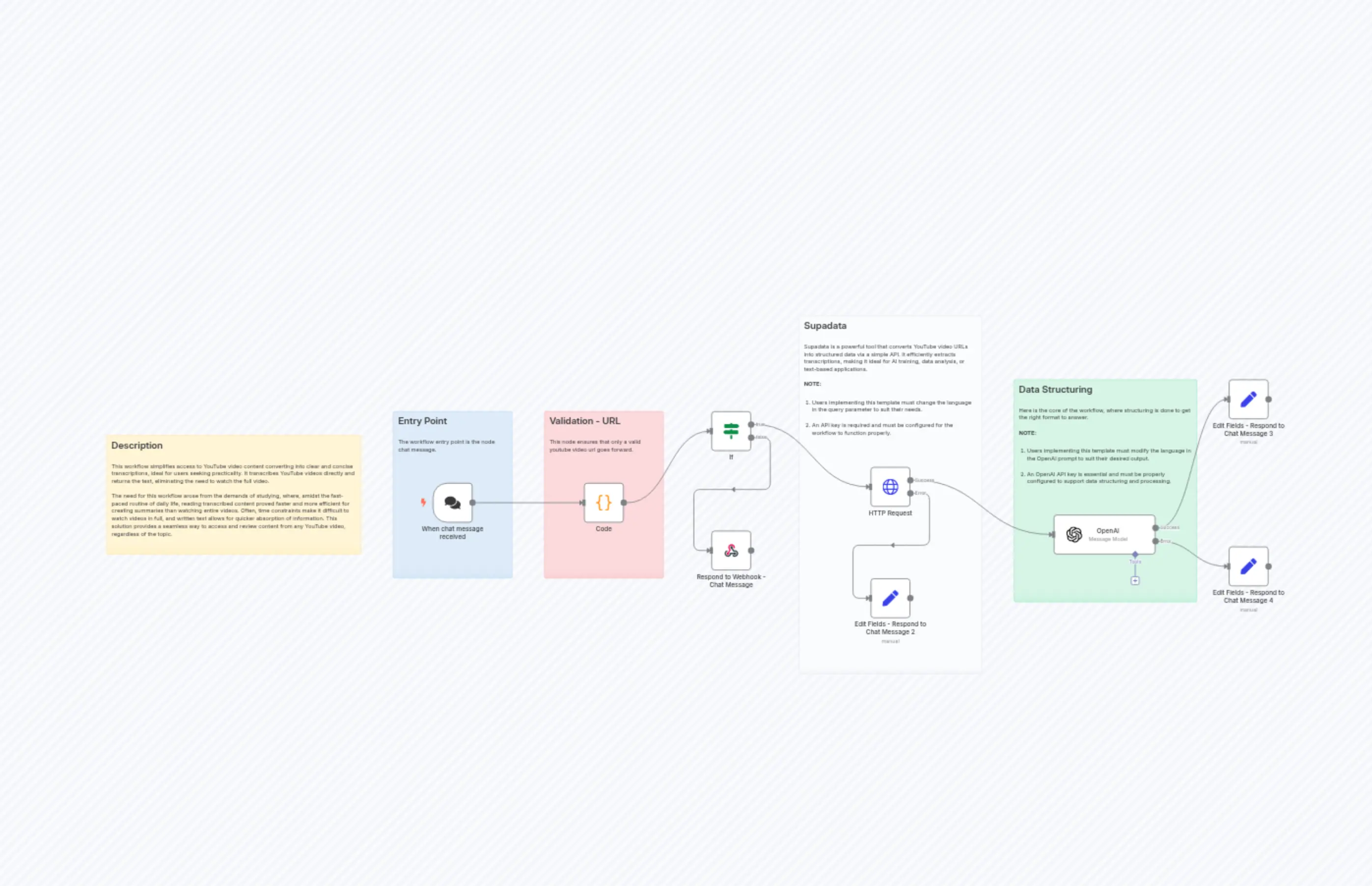 "content": "## Supadata\n\nSupadata is a powerful tool that converts YouTube video URLs into structured data via a simple API. It efficiently extracts transcriptions, making it ideal for AI training, data analysis, or text-based applications.\n\n**NOTE:**\n\n1. Users implementing this template must change the language in the query parameter to suit their needs. \n\n2. An API key is required and must be configured for the workflow to function properly."