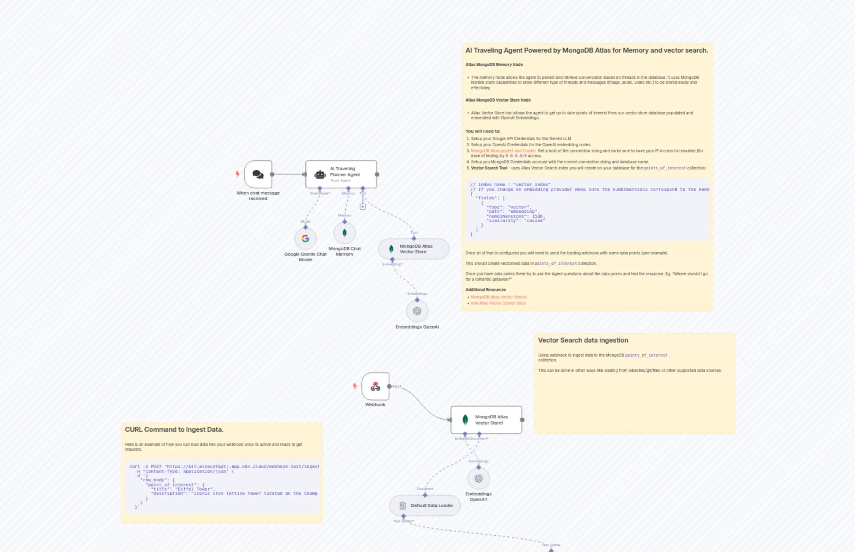 "content": "## AI Traveling Agent Powered by MongoDB Atlas for Memory and vector search.\n\n**Atlas MongoDB Memory Node**\n\n- The memory node allows the agent to persist and retrieve conversation based on threads in the database. It uses MongoDB felxible store capabilities to allow different type of threads and messages (Image, audio, video etc.) to be stored easily and effectivley \n\n\n**Atlas MongoDB Vector Store Node**\n\n- Atlas Vector Store tool allows the agent to get up to date points of interest from our vector store database populated and embedded with OpenAI Embeddings.\n\n\n### You will need to:\n1. Setup your Google API Credentials for the Gemini LLM\n2. Setup your OpenAI Credentials for the OpenAI embedding nodes.\n3. [MongoDB Atlas project and Cluster](https://www.mongodb.com/docs/atlas/tutorial/create-new-cluster/). Get a hold of the connection string and make sure to have your IP Access list enabled (for ease of testing try `0.0.0.0/0` access.\n4. Setup you MongoDB Credentials account with the correct connection string and database name.\n5. **Vector Search Tool** - uses Atlas Vector Search index you will create on your database for the `points_of_interest` collection:\n\n```\n// index name : \"vector_index\"\n// If you change an embedding provider make sure the numDimensions correspond to the model.\n{\n \"fields\": [\n {\n \"type\": \"vector\",\n \"path\": \"embedding\",\n \"numDimensions\": 1536,\n \"similarity\": \"cosine\"\n }\n ]\n}\n```\n\nOnce all of that is configured you will need to send the loading webhook with some data points (see example).\n\nThis should create vectorised data in `points_of_interest` collection.\n\nOnce you have data points there try to ask the Agent questions about the data points and test the response. Eg. \"Where should I go for a romantic getaway?\"\n\n**Additional Resources**\n- [MongoDB Atlas Vector Search](https://www.mongodb.com/docs/atlas/atlas-vector-search/tutorials/vector-search-quick-start/?utm=n8n.io)\n- [n8n Atlas Vector Search docs](https://docs.n8n.io/integrations/builtin/cluster-nodes/root-nodes/n8n-nodes-langchain.vectorstoremongodbatlas?utm=n8n.io)"