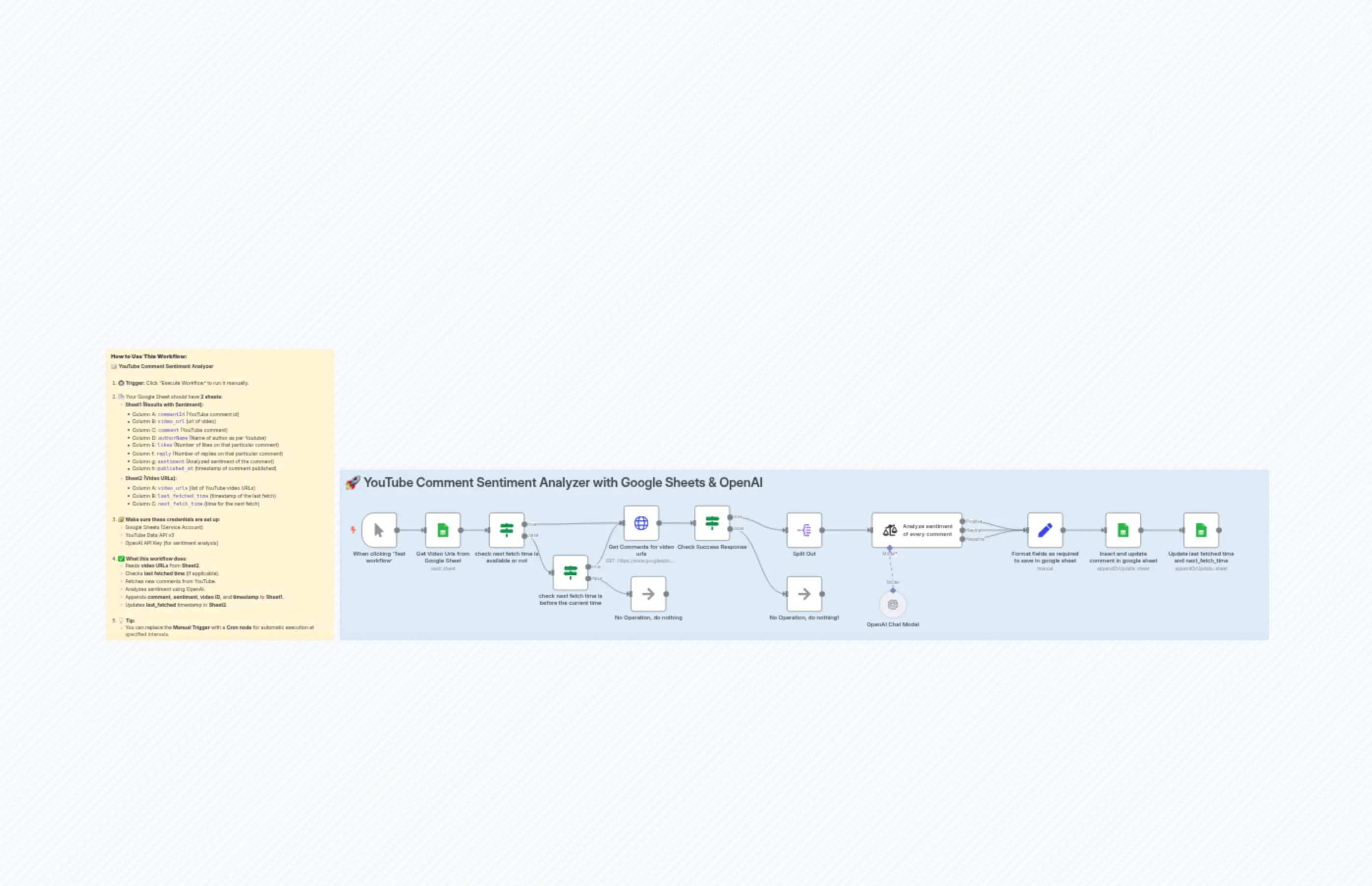**What this workflow does**:\n - Reads **video URLs** from **Sheet2**.\n - Checks **last fetched time** (if applicable).\n - Fetches new comments from YouTube.\n - Analyzes sentiment using OpenAI.\n - Appends **comment**, **sentiment**, **video ID**, and **timestamp** to **Sheet1**.\n - Updates **last_fetched** timestamp in **Sheet2**.\n\n5. π‘ **Tip:**\n - You can replace the **Manual Trigger** with a **Cron node** for automatic execution at specified intervals.\n"
