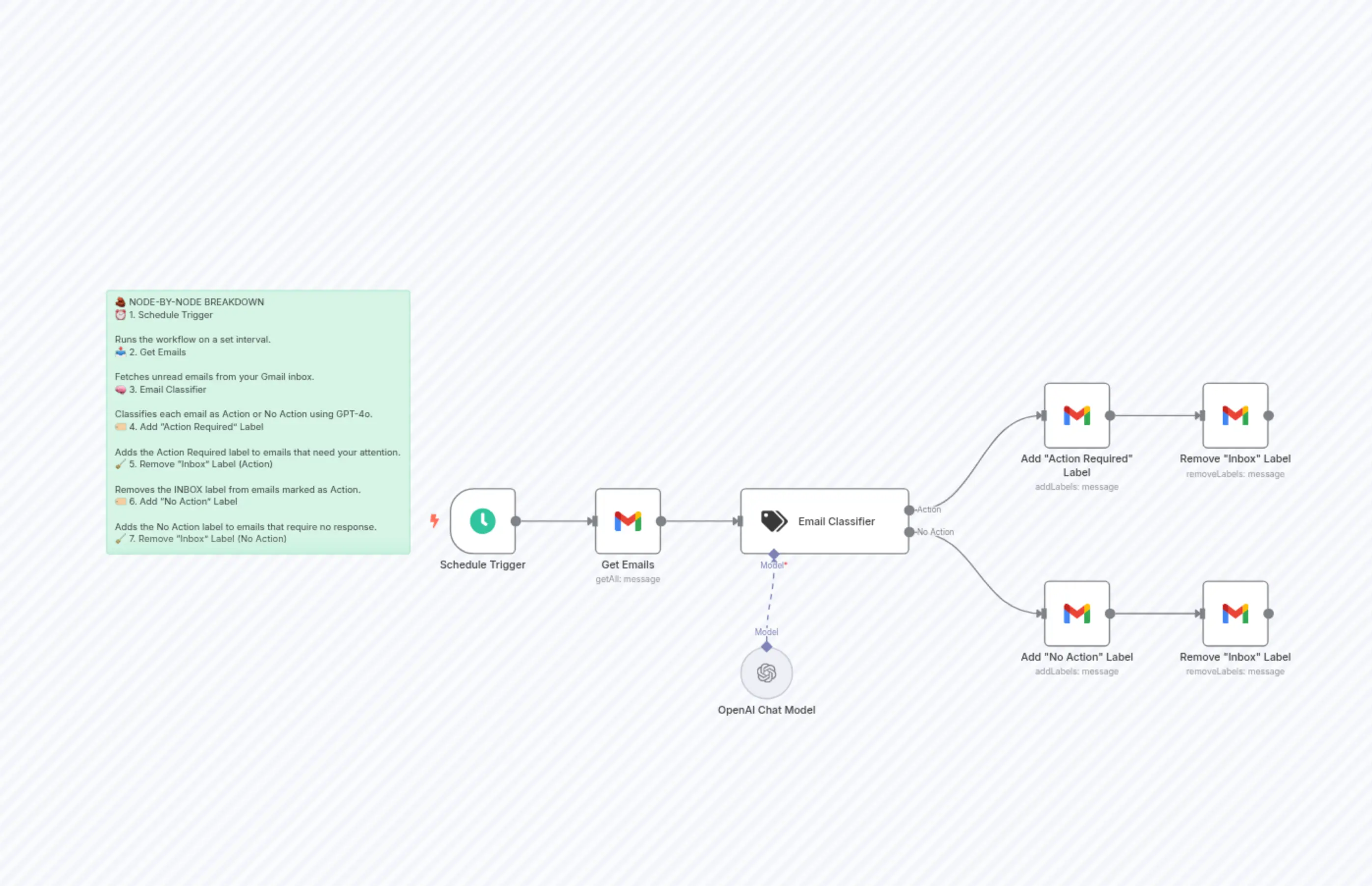 "content": "🧱 NODE-BY-NODE BREAKDOWN\n⏰ 1. Schedule Trigger\n\nRuns the workflow on a set interval.\n📥 2. Get Emails\n\nFetches unread emails from your Gmail inbox.\n🧠 3. Email Classifier\n\nClassifies each email as Action or No Action using GPT-4o.\n🏷️ 4. Add \"Action Required\" Label\n\nAdds the Action Required label to emails that need your attention.\n🧹 5. Remove \"Inbox\" Label (Action)\n\nRemoves the INBOX label from emails marked as Action.\n🏷️ 6. Add \"No Action\" Label\n\nAdds the No Action label to emails that require no response.\n🧹 7. Remove \"Inbox\" Label (No Action)"