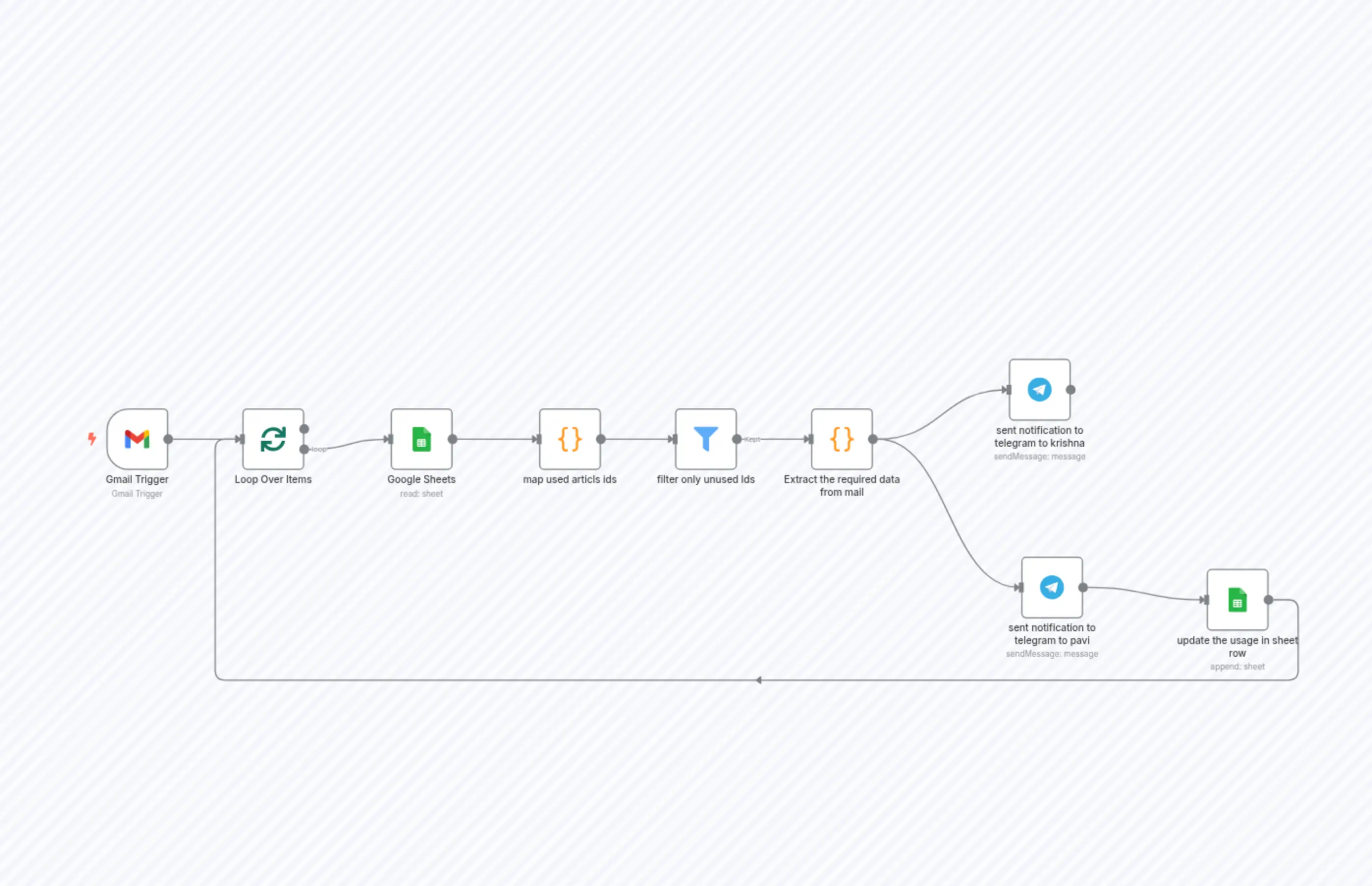 n8n-nodes-base.coden8n-nodes-base.coden8n-nodes-base.filtern8n-nodes-base.telegramn8n-nodes-base.telegramn8n-nodes-base.gmailTriggern8n-nodes-base.googleSheetsn8n-nodes-base.googleSheetsn8n-nodes-base.splitInBatches