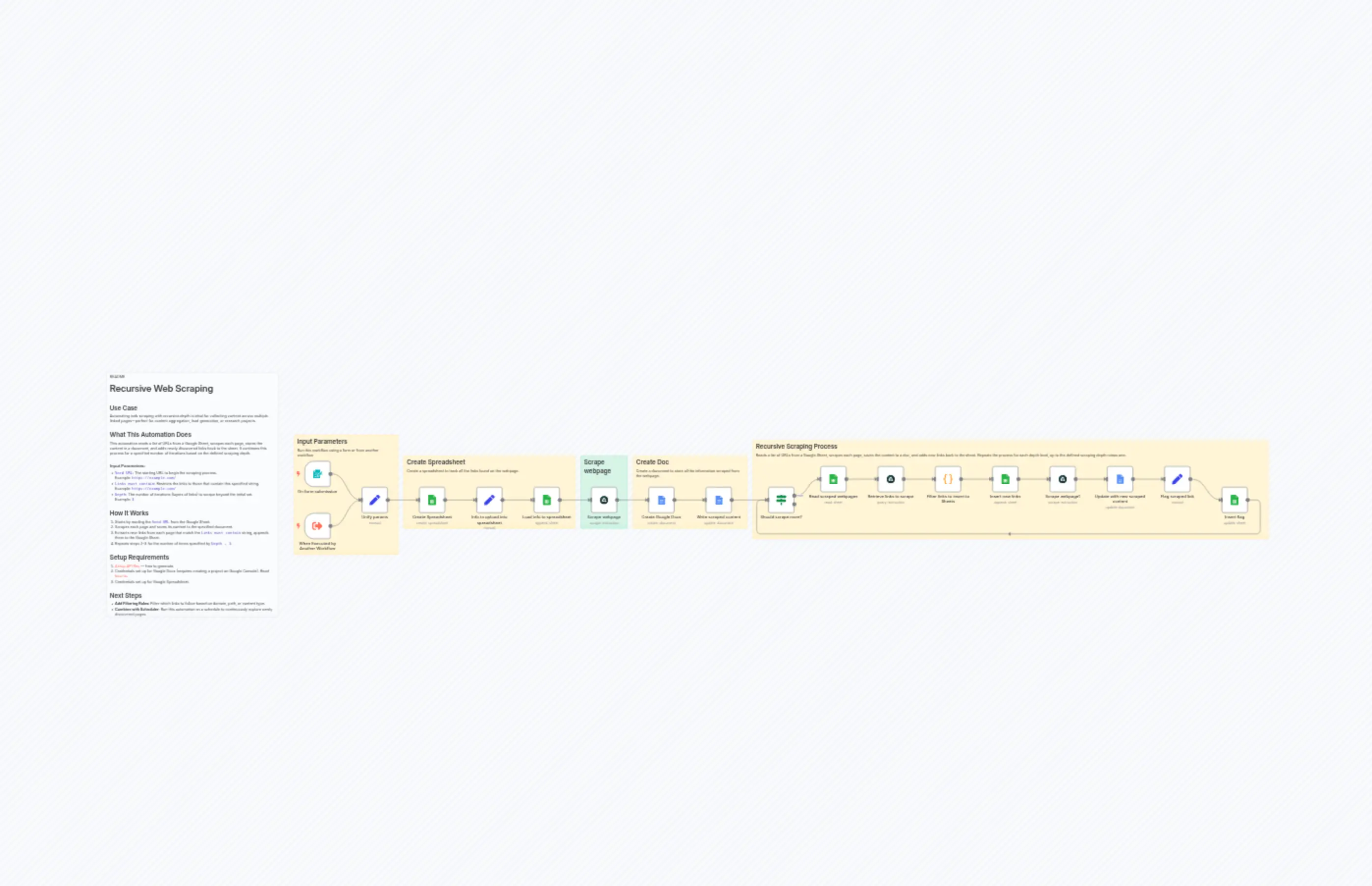 "content": "README\n# Recursive Web Scraping \n\n## Use Case \nAutomating web scraping with recursive depth is ideal for collecting content across multiple linked pages—perfect for content aggregation, lead generation, or research projects.\n\n## What This Automation Does \nThis automation reads a list of URLs from a Google Sheet, scrapes each page, stores the content in a document, and adds newly discovered links back to the sheet. It continues this process for a specified number of iterations based on the defined scraping depth.\n\n### Input Parameters:\n- `Seed URL`: The starting URL to begin the scraping process. \n Example: `https://example.com/`\n- `Links must contain`: Restricts the links to those that contain this specified string. \n Example: `https://example.com/`\n- `Depth`: The number of iterations (layers of links) to scrape beyond the initial set. \n Example: `3`\n\n## How It Works \n1. Starts by reading the `Seed URL` from the Google Sheet.\n2. Scrapes each page and saves its content to the specified document.\n3. Extracts new links from each page that match the `Links must contain` string, appends them to the Google Sheet.\n4. Repeats steps 2–3 for the number of times specified by `Depth - 1`.\n\n## Setup Requirements \n1. [Airtop API Key](https://portal.airtop.ai/api-keys) — free to generate. \n2. Credentials set up for Google Docs (requires creating a project on Google Console). Read [how to](https://docs.n8n.io/integrations/builtin/credentials/google/). \n3. Credentials set up for Google Spreadsheet.\n\n## Next Steps \n- **Add Filtering Rules**: Filter which links to follow based on domain, path, or content type. \n- **Combine with Scheduler**: Run this automation on a schedule to continuously explore newly discovered pages. \n- **Export Structured Data**: Extend the process to store extracted data in a CSV or database for analysis.\n"