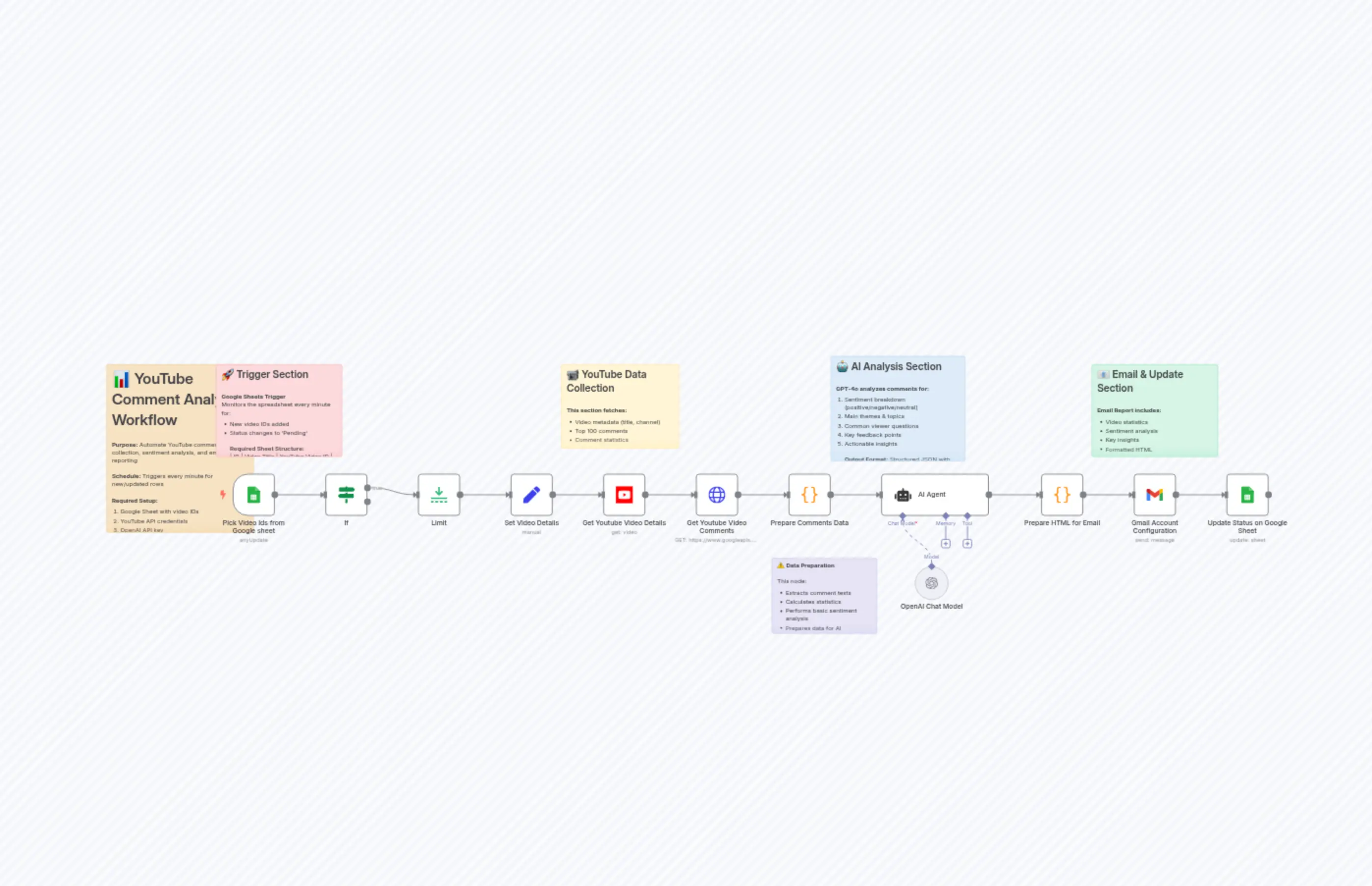 "content": "# 📊 YouTube Comment Analyzer Workflow\n\n**Purpose:** Automate YouTube comment collection, sentiment analysis, and email reporting\n\n**Schedule:** Triggers every minute for new/updated rows\n\n**Required Setup:**\n1. Google Sheet with video IDs\n2. YouTube API credentials\n3. OpenAI API key\n4. Gmail account\n\n## Workflow Steps:\n1. **Trigger** - Monitor Google Sheet\n2. **Filter** - Process only 'Pending' videos\n3. **Fetch** - Get video details & comments\n4. **Analyze** - AI sentiment analysis\n5. **Report** - Send email summary\n6. **Update** - Mark as processed"