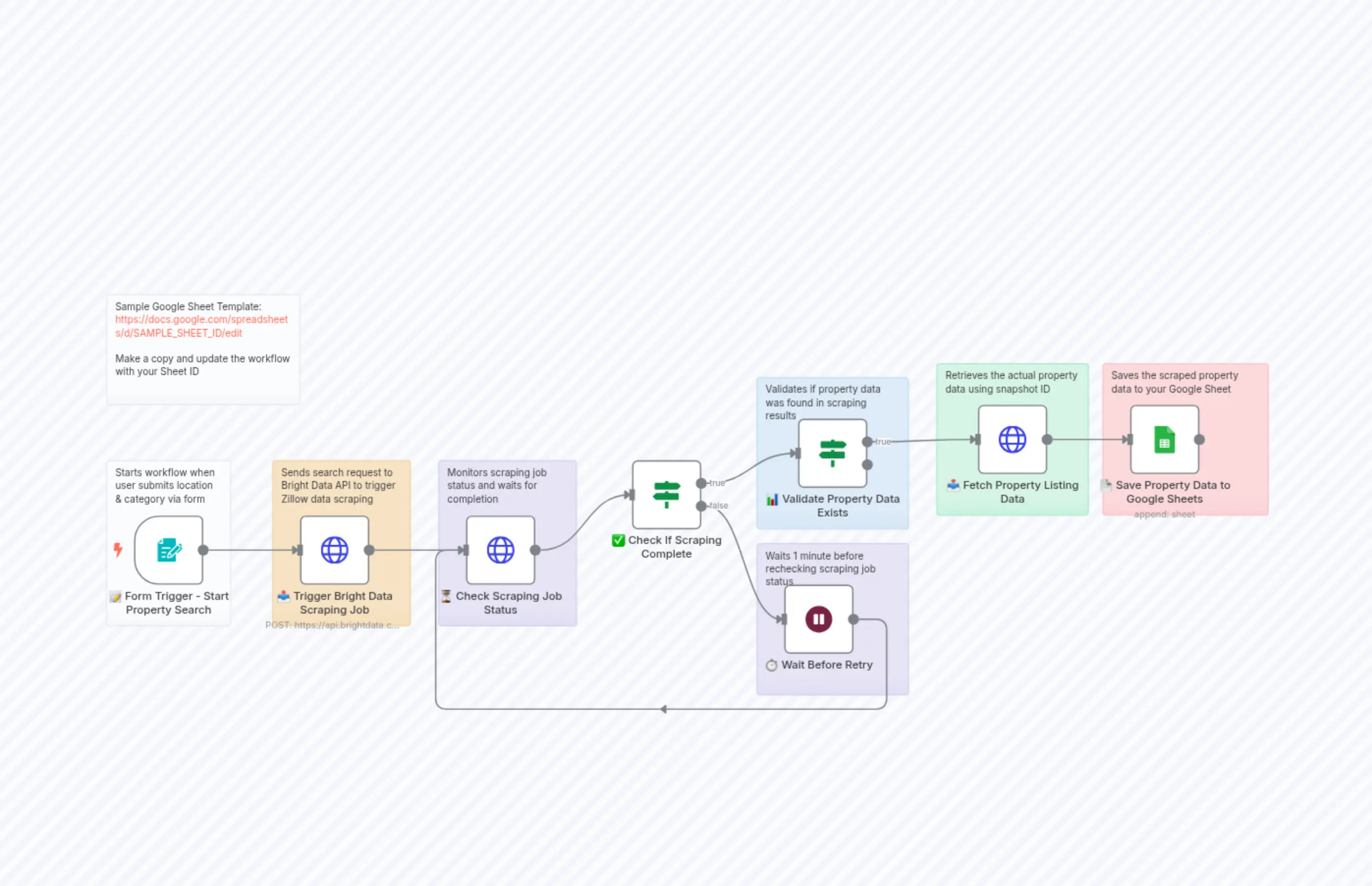 "content": "Sample Google Sheet Template:\nhttps://docs.google.com/spreadsheets/d/SAMPLE_SHEET_ID/edit\n\nMake a copy and update the workflow with your Sheet ID"