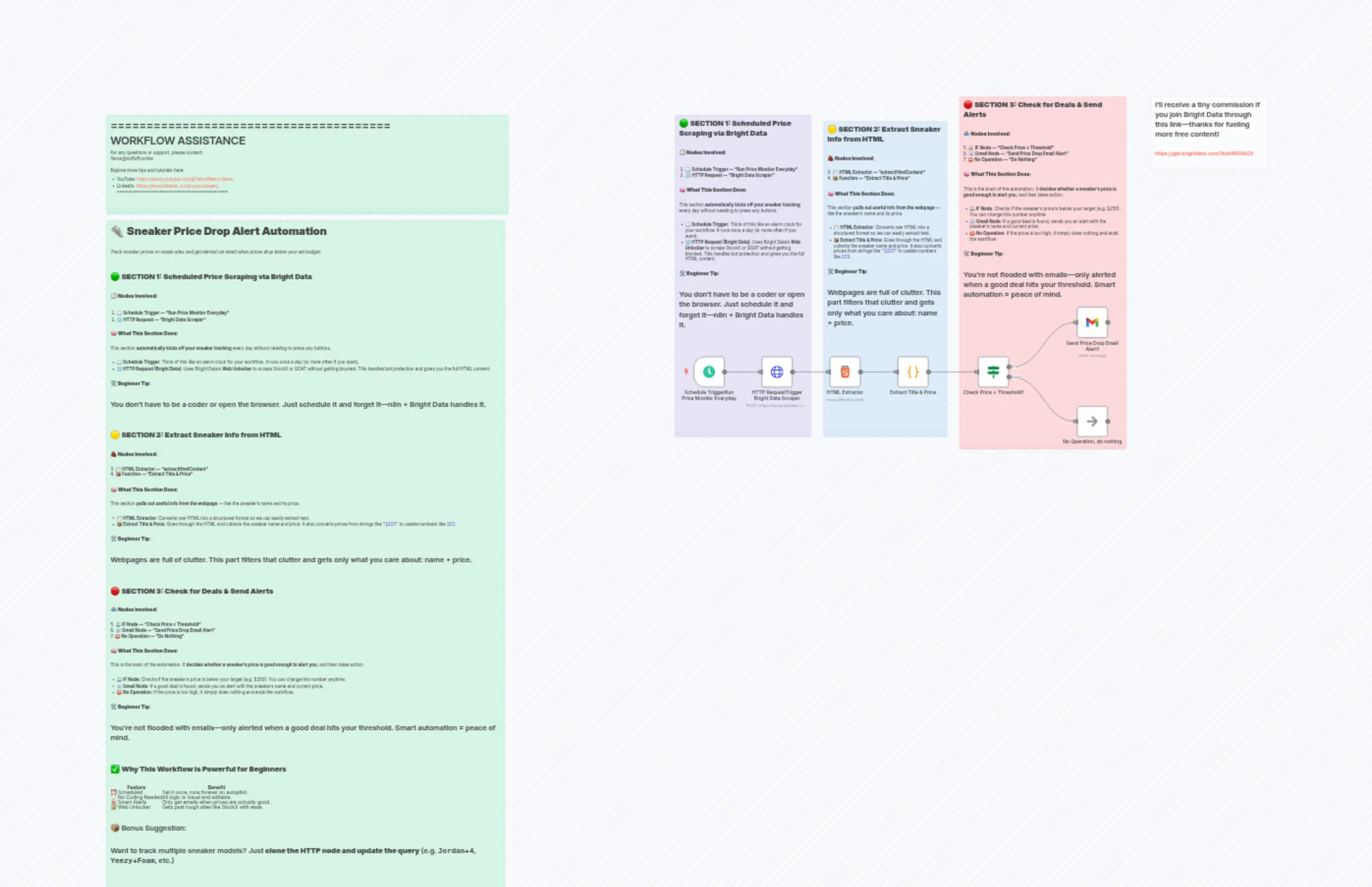 "content": "# 👟 **Sneaker Price Drop Alert Automation**\n\n> *Track sneaker prices on resale sites and get alerted via email when prices drop below your set budget.*\n\n---\n\n## 🟢 **SECTION 1: Scheduled Price Scraping via Bright Data**\n\n### 🧭 **Nodes Involved**:\n\n1. 🕒 **Schedule Trigger — “Run Price Monitor Everyday”**\n2. 🌐 **HTTP Request — “Bright Data Scraper”**\n\n### 🧠 **What This Section Does**:\n\nThis section **automatically kicks off your sneaker tracking** every day without needing to press any buttons.\n\n* **🕒 Schedule Trigger**: Think of this like an alarm clock for your workflow. It runs once a day (or more often if you want).\n* **🌐 HTTP Request (Bright Data)**: Uses Bright Data’s **Web Unlocker** to scrape StockX or GOAT without getting blocked. This handles bot protection and gives you the full HTML content.\n\n### 🛠️ **Beginner Tip**:\n\nYou don’t have to be a coder or open the browser. Just schedule it and forget it—n8n + Bright Data handles it.\n\n---\n\n## 🟡 **SECTION 2: Extract Sneaker Info from HTML**\n\n### 🧱 **Nodes Involved**:\n\n3. 🧾 **HTML Extractor — “extractHtmlContent”**\n4. 📦 **Function — “Extract Title & Price”**\n\n### 🧠 **What This Section Does**:\n\nThis section **pulls out useful info from the webpage** — like the sneaker's name and its price.\n\n* **🧾 HTML Extractor**: Converts raw HTML into a structured format so we can easily extract text.\n* **📦 Extract Title & Price**: Goes through the HTML and collects the sneaker name and price. It also converts prices from strings like `\"$223\"` to usable numbers like `223`.\n\n### 🛠️ **Beginner Tip**:\n\nWebpages are full of clutter. This part filters that clutter and gets only what you care about: name + price.\n\n---\n\n## 🔴 **SECTION 3: Check for Deals & Send Alerts**\n\n### 📤 **Nodes Involved**:\n\n5. ⚖️ **IF Node — “Check Price < Threshold”**\n6. 📧 **Gmail Node — “Send Price Drop Email Alert”**\n7. ⛔ **No Operation — “Do Nothing”**\n\n### 🧠 **What This Section Does**:\n\nThis is the brain of the automation. It **decides whether a sneaker's price is good enough to alert you**, and then takes action.\n\n* **⚖️ IF Node**: Checks if the sneaker's price is below your target (e.g. \\$250). You can change this number anytime.\n* **📧 Gmail Node**: If a good deal is found, sends you an alert with the sneaker’s name and current price.\n* **⛔ No Operation**: If the price is too high, it simply does nothing and ends the workflow.\n\n### 🛠️ **Beginner Tip**:\n\nYou're not flooded with emails—only alerted when a good deal hits your threshold. Smart automation = peace of mind.\n\n---\n\n## ✅ **Why This Workflow is Powerful for Beginners**\n\n| Feature | Benefit |\n| ------------------- | ------------------------------------------------ |\n| ⏰ Scheduled | Set it once, runs forever on autopilot. |\n| 💡 No Coding Needed | All logic is visual and editable. |\n| 💌 Smart Alerts | Only get emails when prices are *actually* good. |\n| 🔐 Web Unlocker | Gets past tough sites like StockX with ease. |\n\n---\n\n## 📦 Bonus Suggestion:\n\nWant to track multiple sneaker models? Just **clone the HTTP node and update the query** (e.g. `Jordan+4`, `Yeezy+Foam`, etc.)\n\n---\n\n"