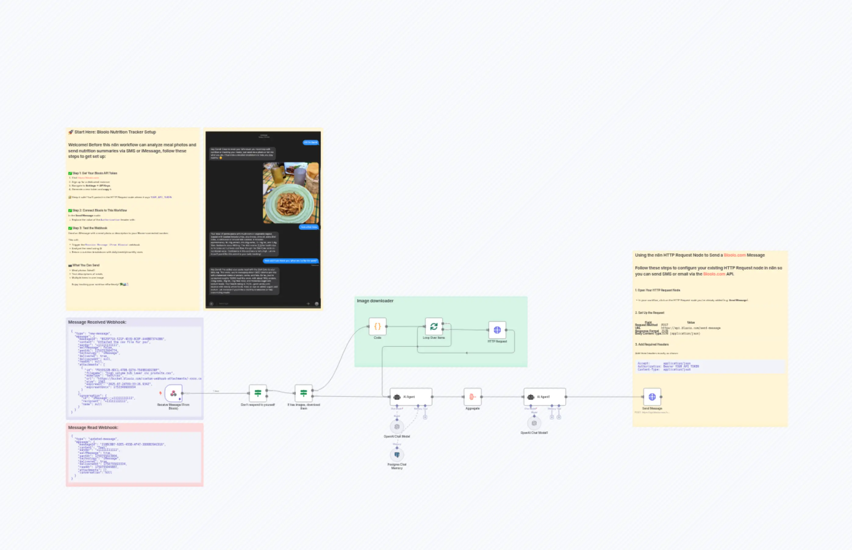 "content": "## π Start Here: Blooio Nutrition Tracker Setup\n\nWelcome! Before this n8n workflow can analyze meal photos and send nutrition summaries via SMS or iMessage, follow these steps to get set up:\n\n---\n\n### β