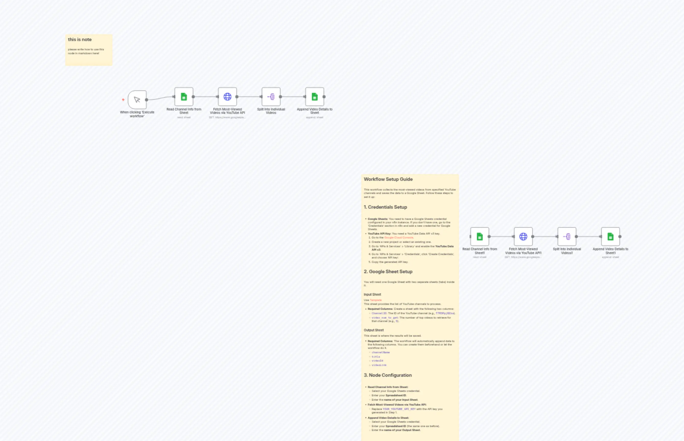 "content": "## Workflow Setup Guide\n\nThis workflow collects the most-viewed videos from specified YouTube channels and saves the data to a Google Sheet. Follow these steps to set it up:\n\n## 1. Credentials Setup\n\n* **Google Sheets:** You need to have a Google Sheets credential configured in your n8n instance. If you don't have one, go to the 'Credentials' section in n8n and add a new credential for Google Sheets.\n* **YouTube API Key:** You need a YouTube Data API v3 key.\n 1. Go to the [Google Cloud Console](https://console.cloud.google.com/).\n 2. Create a new project or select an existing one.\n 3. Go to 'APIs & Services' > 'Library' and enable the **YouTube Data API v3**.\n 4. Go to 'APIs & Services' > 'Credentials', click 'Create Credentials', and choose 'API key'.\n 5. Copy the generated API key.\n\n## 2. Google Sheet Setup\n\nYou will need one Google Sheet with two separate sheets (tabs) inside it.\n\n### Input Sheet\nUse [Template](https://docs.google.com/spreadsheets/d/1EwALToSWKp4EyzPCx4q3rhMHMaJ3MMfwXQoZmC2BWZk/edit?usp=sharing)\nThis sheet provides the list of YouTube channels to process.\n* **Required Columns:** Create a sheet with the following two columns:\n * `ChannelID`: The ID of the YouTube channel (e.g., `T7M3PpjBZzw`).\n * `video_num_to_get`: The number of top videos to retrieve for that channel (e.g., `5`).\n\n### Output Sheet\nThis sheet is where the results will be saved.\n* **Required Columns:** The workflow will automatically append data to the following columns. You can create them beforehand or let the workflow do it.\n * `channelName`\n * `title`\n * `videoId`\n * `videoLink`\n\n## 3. Node Configuration\n\n* **Read Channel Info from Sheet:** \n * Select your Google Sheets credential.\n * Enter your **Spreadsheet ID**.\n * Enter the **name of your Input Sheet**.\n* **Fetch Most-Viewed Videos via YouTube API:** \n * Replace `YOUR_YOUTUBE_API_KEY` with the API key you generated in Step 1.\n* **Append Video Details to Sheet:**\n * Select your Google Sheets credential.\n * Enter your **Spreadsheet ID** (the same one as before).\n * Enter the **name of your Output Sheet**."