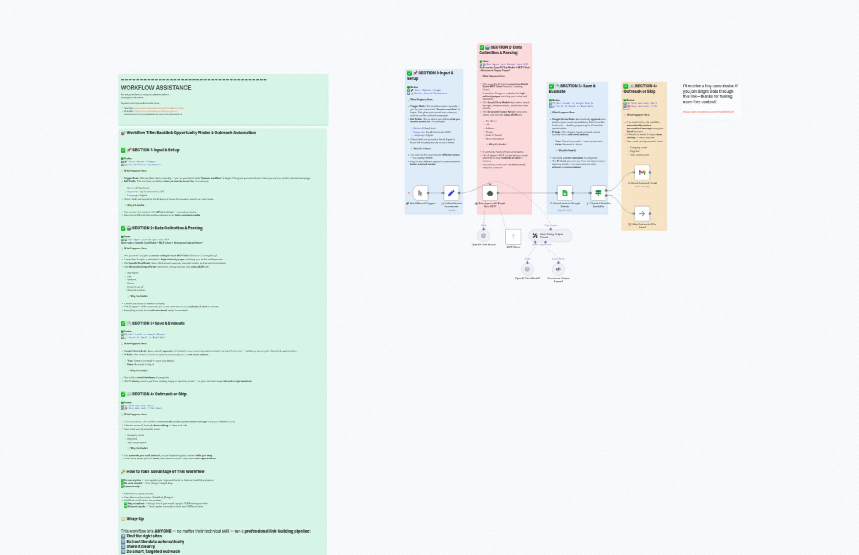 "content": "## 🎯 **Workflow Title: Backlink Opportunity Finder & Outreach Automation**\n\n---\n\n## ✅ **📌 SECTION 1: Input & Setup**\n\n**🟢 Nodes:**\n1️⃣ `🚀 Start Manual Trigger`\n2️⃣ `📝 Define Search Parameters`\n\n**💡 What Happens Here:**\n\n* **Trigger Node:** The workflow starts manually — you (or your team) click **‘Execute workflow’** to begin. This gives you control over when you want to run the outreach campaign.\n* **Edit Fields:** This is where you define **what you want to search for**. For example:\n\n * `Niche`: *AI SaaS tools*\n * `Keywords`: *Top AI directories 2025*\n * `Language`: *English*\n* These fields are passed to the AI Agent to focus the scraping exactly on your needs.\n\n**✨ Why It’s Useful:**\n\n* You can run this anytime with **different niches** — no coding needed.\n* Easy to test different keyword combinations for **better outreach results**.\n\n---\n\n## ✅ **🤖 SECTION 2: Data Collection & Parsing**\n\n**🟢 Node:**\n3️⃣ `🤖 Run Agent with Bright Data MCP`\n**(Sub-nodes: OpenAI Chat Model + MCP Client + Structured Output Parser)**\n\n**💡 What Happens Here:**\n\n* This powerful AI Agent **connects to Bright Data’s MCP Client** (Massive Crawling Proxy).\n* It searches Google or websites for **high-authority pages** matching your niche and keywords.\n* The **OpenAI Chat Model** helps refine search prompts, interpret results, and format them cleanly.\n* The **Structured Output Parser** transforms messy raw text into **clean JSON** with:\n\n * Site Name\n * URL\n * Address\n * Phone\n * Email (if found)\n * Short description\n\n**✨ Why It’s Useful:**\n\n* It saves you hours of manual scraping.\n* The AI Agent + MCP combo lets you scale searches across **hundreds of sites** in minutes.\n* Everything comes back **well-structured**, ready for outreach.\n\n---\n\n## ✅ **📄 SECTION 3: Save & Evaluate**\n\n**🟢 Nodes:**\n4️⃣ `📄 Save Leads to Google Sheets`\n5️⃣ `🔎 Check if Email is Available`\n\n**💡 What Happens Here:**\n\n* **Google Sheets Node:** Automatically **appends** new leads to your master spreadsheet. Each run adds fresh rows — building a growing list of backlink opportunities.\n* **IF Node:** This checks if each scraped record actually has a **valid email address**.\n\n * **True:** There *is* an email → move to outreach.\n * **False:** No email → skip it.\n\n**✨ Why It’s Useful:**\n\n* You build a **central database** of prospects.\n* The **IF check** prevents you from sending empty or spammy emails — so your outreach stays **relevant** and **personalized**.\n\n---\n\n## ✅ **📧 SECTION 4: Outreach or Skip**\n\n**🟢 Nodes:**\n6️⃣ `📧 Send Outreach Email`\n7️⃣ `🚫 Skip Outreach if No Email`\n\n**💡 What Happens Here:**\n\n* If an email exists, the workflow **automatically sends a personalized message** using your **Gmail** account.\n* If there’s *no* email, it simply **does nothing** — clean and safe.\n* Your email can dynamically insert:\n\n * Company name\n * Page link\n * Your custom pitch\n\n**✨ Why It’s Useful:**\n\n* You **automate your cold outreach**, so you’re pitching your content **while you sleep**.\n* Saves time, keeps your list **clean**, and makes sure you only contact **real opportunities**.\n\n---\n\n## 🔑 **How to Take Advantage of This Workflow**\n\n✅ **Re-run anytime** — Just update your keywords/niche to find new backlink prospects.\n✅ **No code needed** — Everything is drag & drop.\n✅ **Expand easily** —\n\n* Add more scraping sources.\n* Use other email providers (SendGrid, Mailgun).\n* Add Slack notifications for updates.\n ✅ **Stay compliant** — Always check your email copy for GDPR/anti-spam rules.\n ✅ **Measure results** — Track replies manually or hook into CRM tools later.\n\n---\n\n## 🌟 **Wrap-Up**\n\nThis workflow lets **ANYONE** — no matter their technical skill — run a **professional link-building pipeline**:\n1️⃣ **Find the right sites**\n2️⃣ **Extract the data automatically**\n3️⃣ **Store it cleanly**\n4️⃣ **Do smart, targeted outreach**\n\n---\n\n"