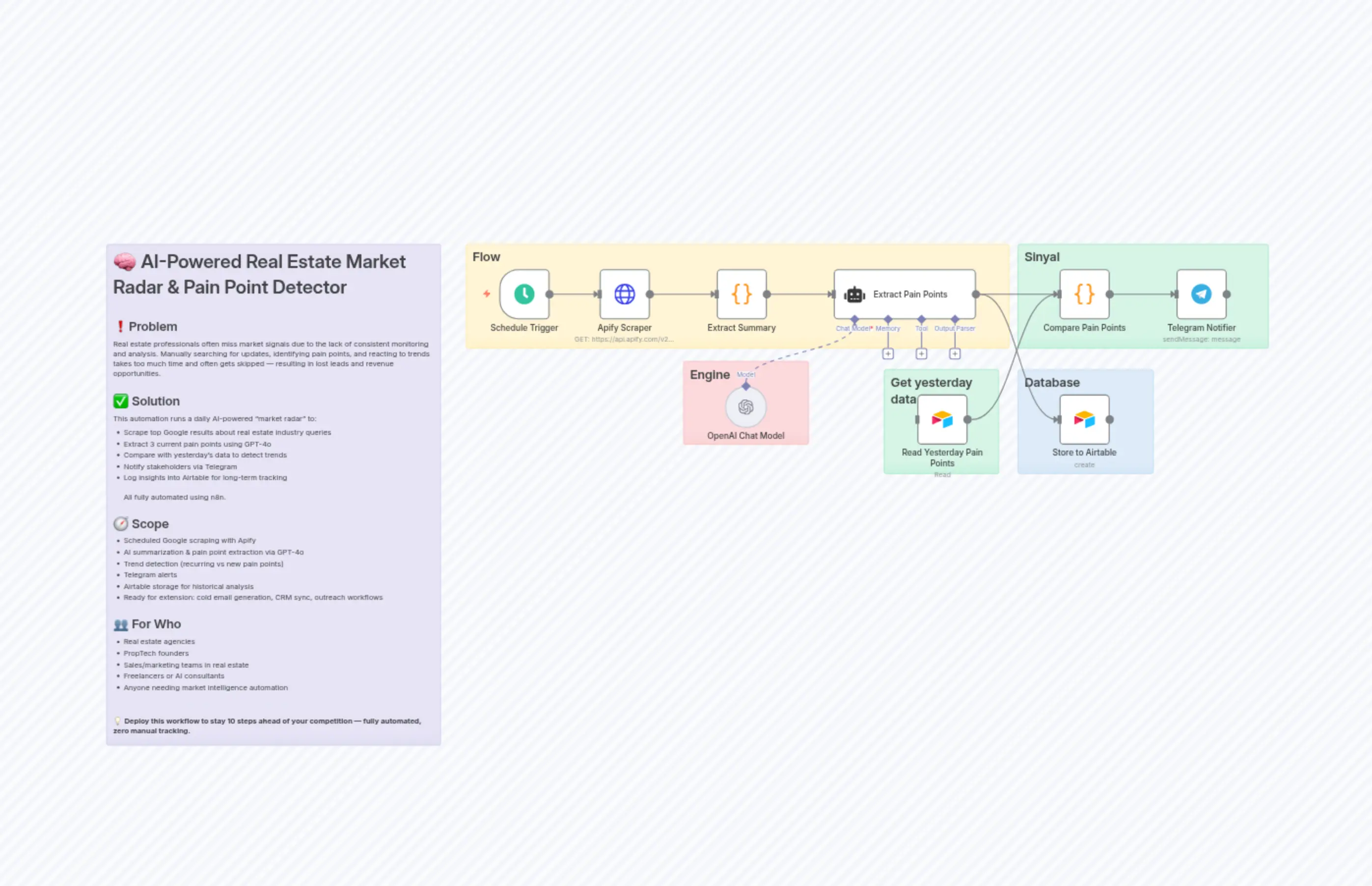 "content": "# 🧠 AI-Powered Real Estate Market Radar & Pain Point Detector\n\n## ❗️Problem \nReal estate professionals often miss market signals due to the lack of consistent monitoring and analysis. Manually searching for updates, identifying pain points, and reacting to trends takes too much time and often gets skipped — resulting in lost leads and revenue opportunities.\n\n## ✅ Solution \nThis automation runs a daily AI-powered \"market radar\" to:\n- Scrape top Google results about real estate industry queries \n- Extract 3 current pain points using GPT-4o \n- Compare with yesterday’s data to detect trends \n- Notify stakeholders via Telegram \n- Log insights into Airtable for long-term tracking\n\nAll fully automated using n8n.\n\n## 🧭 Scope \n- Scheduled Google scraping with Apify \n- AI summarization & pain point extraction via GPT-4o \n- Trend detection (recurring vs new pain points) \n- Telegram alerts \n- Airtable storage for historical analysis \n- Ready for extension: cold email generation, CRM sync, outreach workflows\n\n## 👥 For Who \n- Real estate agencies \n- PropTech founders \n- Sales/marketing teams in real estate \n- Freelancers or AI consultants \n- Anyone needing market intelligence automation\n\n---\n\n💡 **Deploy this workflow to stay 10 steps ahead of your competition — fully automated, zero manual tracking.**\n\n"