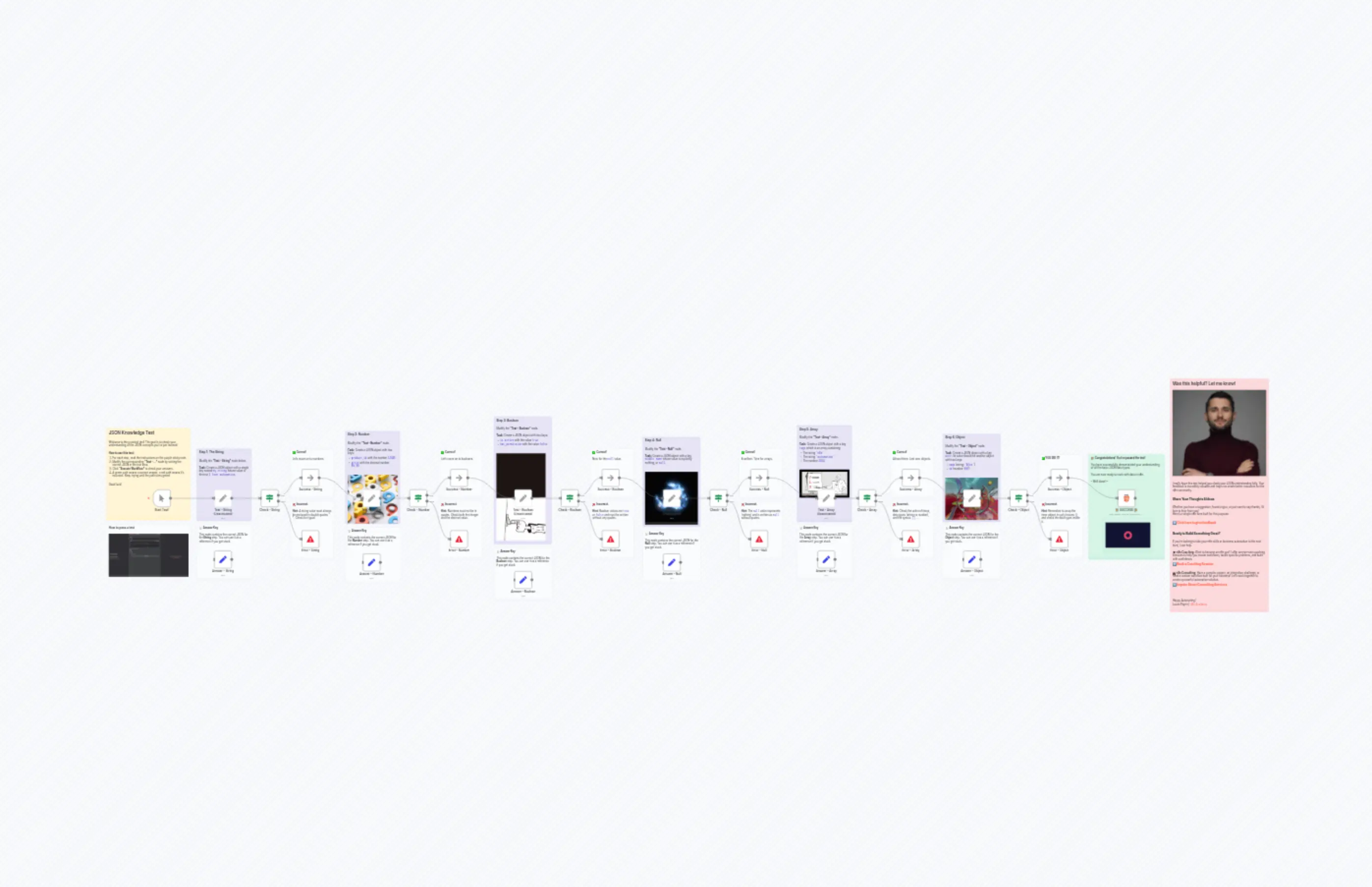 "content": "## Was this helpful? Let me know!\n[](https://n8n.ac)\n\nI really hope this test helped you check your JSON understanding fully. Your feedback is incredibly valuable and helps me create better resources for the n8n community.\n\n### **Share Your Thoughts & Ideas**\n\nWhether you have a suggestion, found a typo, or just want to say thanks, I'd love to hear from you!\nHere's a simple n8n form built for this purpose:\n\n#### ➡️ **[Click here to give feedback](https://api.ia2s.app/form/templates/feedback?template=JSON%20Test)**\n\n### **Ready to Build Something Great?**\n\nIf you're looking to take your n8n skills or business automation to the next level, I can help.\n\n**🎓 n8n Coaching:** Want to become an n8n pro? I offer one-on-one coaching sessions to help you master workflows, tackle specific problems, and build with confidence.\n#### ➡️ **[Book a Coaching Session](https://api.ia2s.app/form/templates/coaching?template=JSON%20Test)**\n\n**💼 n8n Consulting:** Have a complex project, an integration challenge, or need a custom workflow built for your business? Let's work together to create a powerful automation solution.\n#### ➡️ **[Inquire About Consulting Services](https://api.ia2s.app/form/templates/consulting?template=JSON%20Test)**\n\n---\n\nHappy Automating!\nLucas Peyrin | [n8n Academy](https://n8n.ac)"