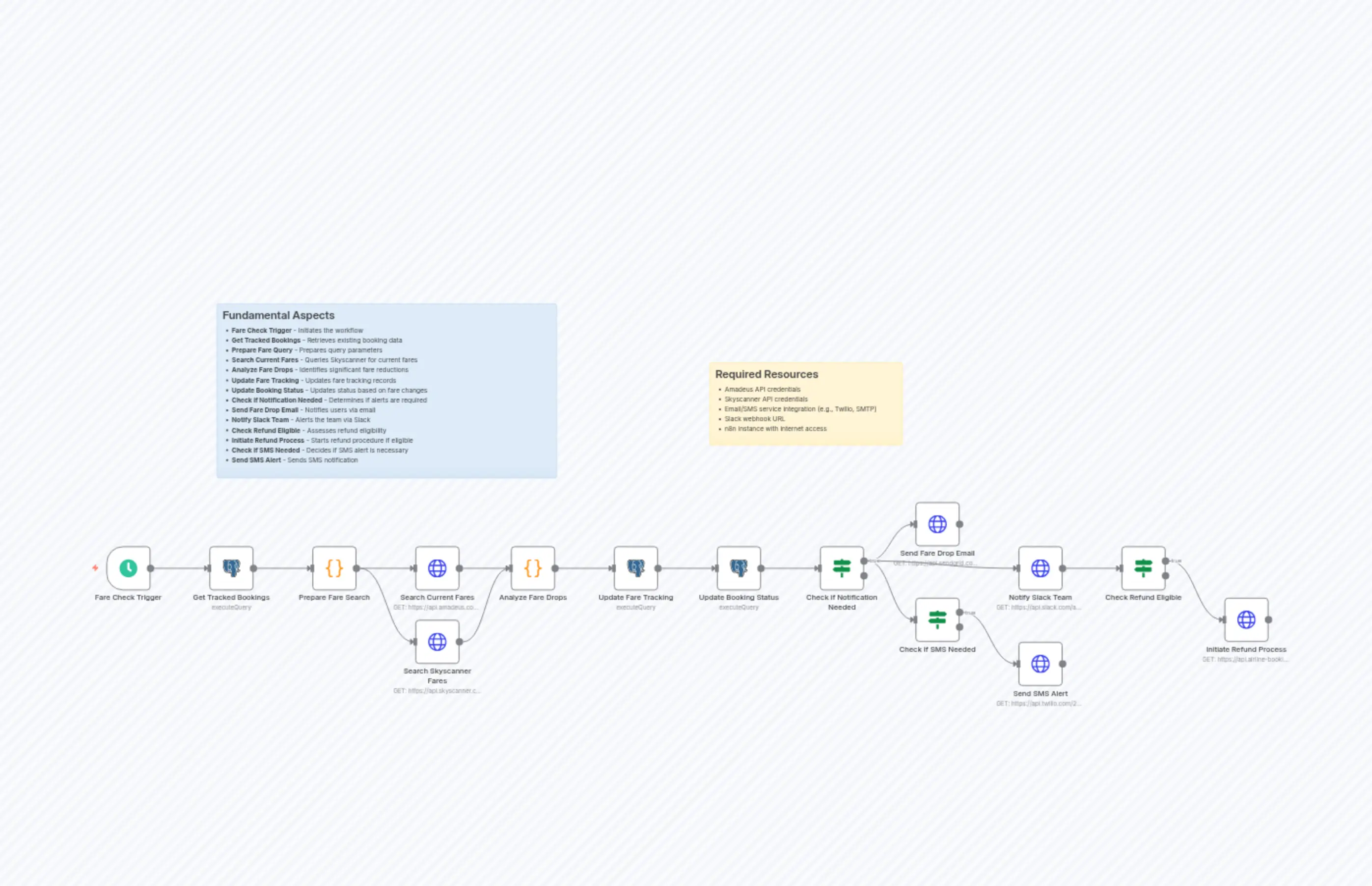 "content": "\n## Fundamental Aspects\n- **Fare Check Trigger** - Initiates the workflow\n- **Get Tracked Bookings** - Retrieves existing booking data\n- **Prepare Fare Query** - Prepares query parameters\n- **Search Current Fares** - Queries Skyscanner for current fares\n- **Analyze Fare Drops** - Identifies significant fare reductions\n- **Update Fare Tracking** - Updates fare tracking records\n- **Update Booking Status** - Updates status based on fare changes\n- **Check if Notification Needed** - Determines if alerts are required\n- **Send Fare Drop Email** - Notifies users via email\n- **Notify Slack Team** - Alerts the team via Slack\n- **Check Refund Eligible** - Assesses refund eligibility\n- **Initiate Refund Process** - Starts refund procedure if eligible\n- **Check if SMS Needed** - Decides if SMS alert is necessary\n- **Send SMS Alert** - Sends SMS notification"