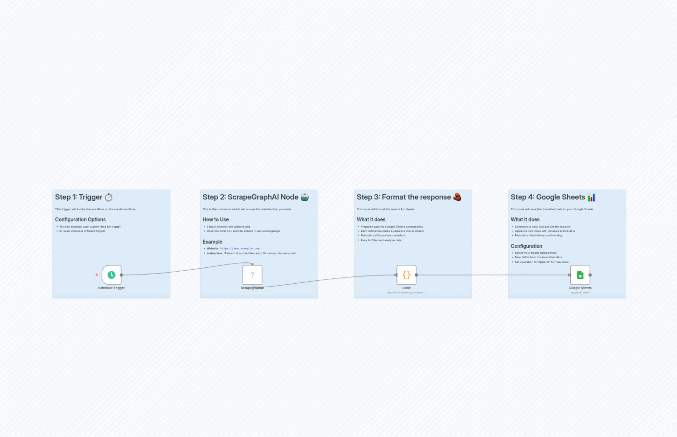 "content": "# Step 4: Google Sheets 📊\n\nThis node will save the formatted data to your Google Sheets.\n\n## What it does\n- Connects to your Google Sheets account\n- Appends new rows with scraped article data\n- Maintains data history and tracking\n\n## Configuration\n- Select your target spreadsheet\n- Map fields from the formatted data\n- Set operation to \"Append\" for new rows\n"