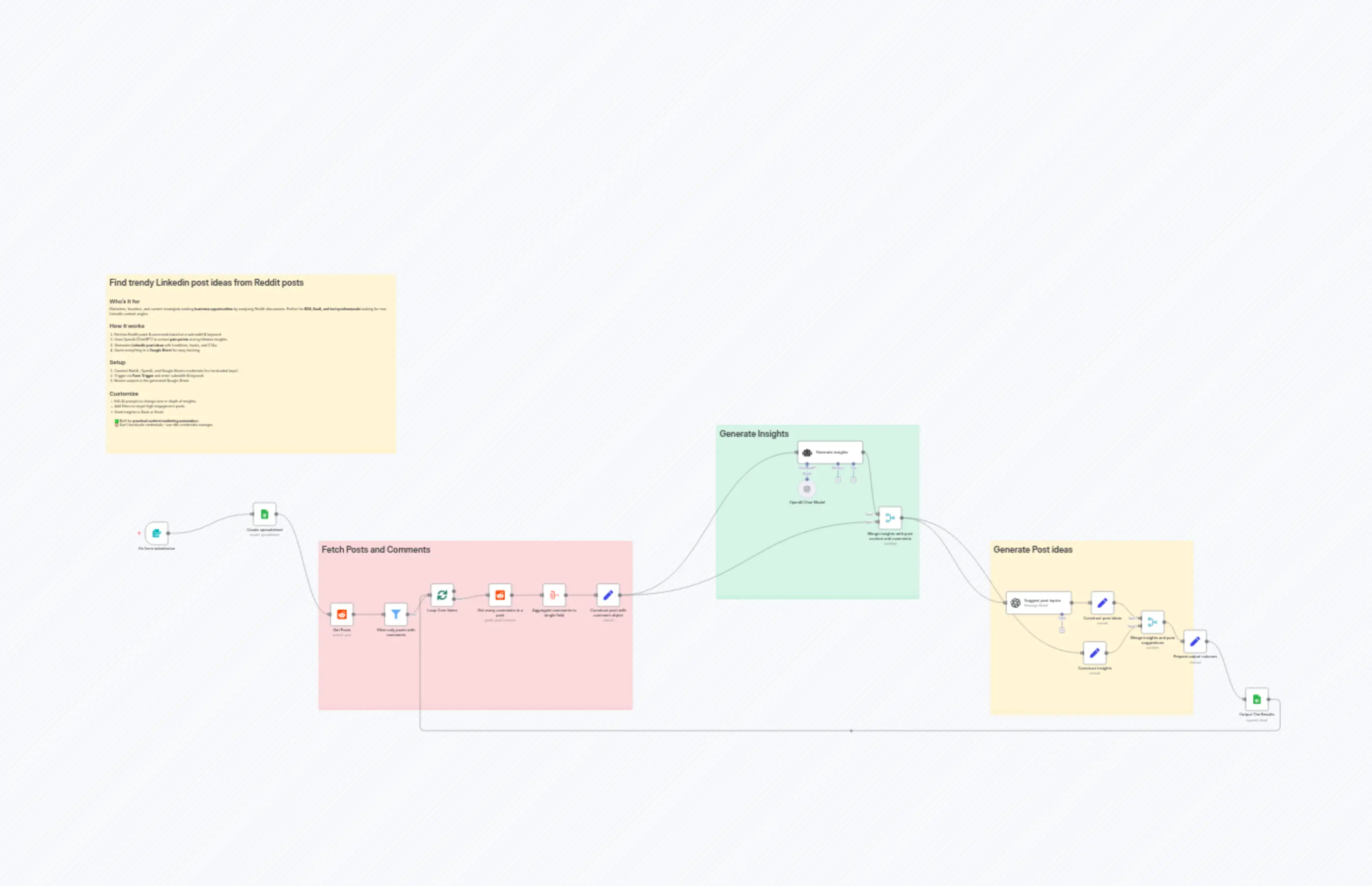 "content": "# Find trendy Linkedin post ideas from Reddit posts\n\n## Who’s it for \nMarketers, founders, and content strategists seeking **business opportunities** by analyzing Reddit discussions. Perfect for **B2B, SaaS, and tech professionals** looking for new LinkedIn content angles.\n\n## How it works \n1. Fetches Reddit posts & comments based on a subreddit & keyword. \n2. Uses OpenAI (ChatGPT) to extract **pain points** and synthesize insights. \n3. Generates **LinkedIn post ideas** with headlines, hooks, and CTAs. \n4. Saves everything in a **Google Sheet** for easy tracking.\n\n## Setup \n1. Connect Reddit, OpenAI, and Google Sheets credentials (no hardcoded keys). \n2. Trigger via **Form Trigger** and enter subreddit & keyword. \n3. Review outputs in the generated Google Sheet.\n\n## Customize \n- Edit AI prompts to change tone or depth of insights. \n- Add filters to target high-engagement posts. \n- Send insights to Slack or Email.\n\n✅ Built for **practical content marketing automation**. \n🚫 Don’t hardcode credentials – use n8n credentials manager."