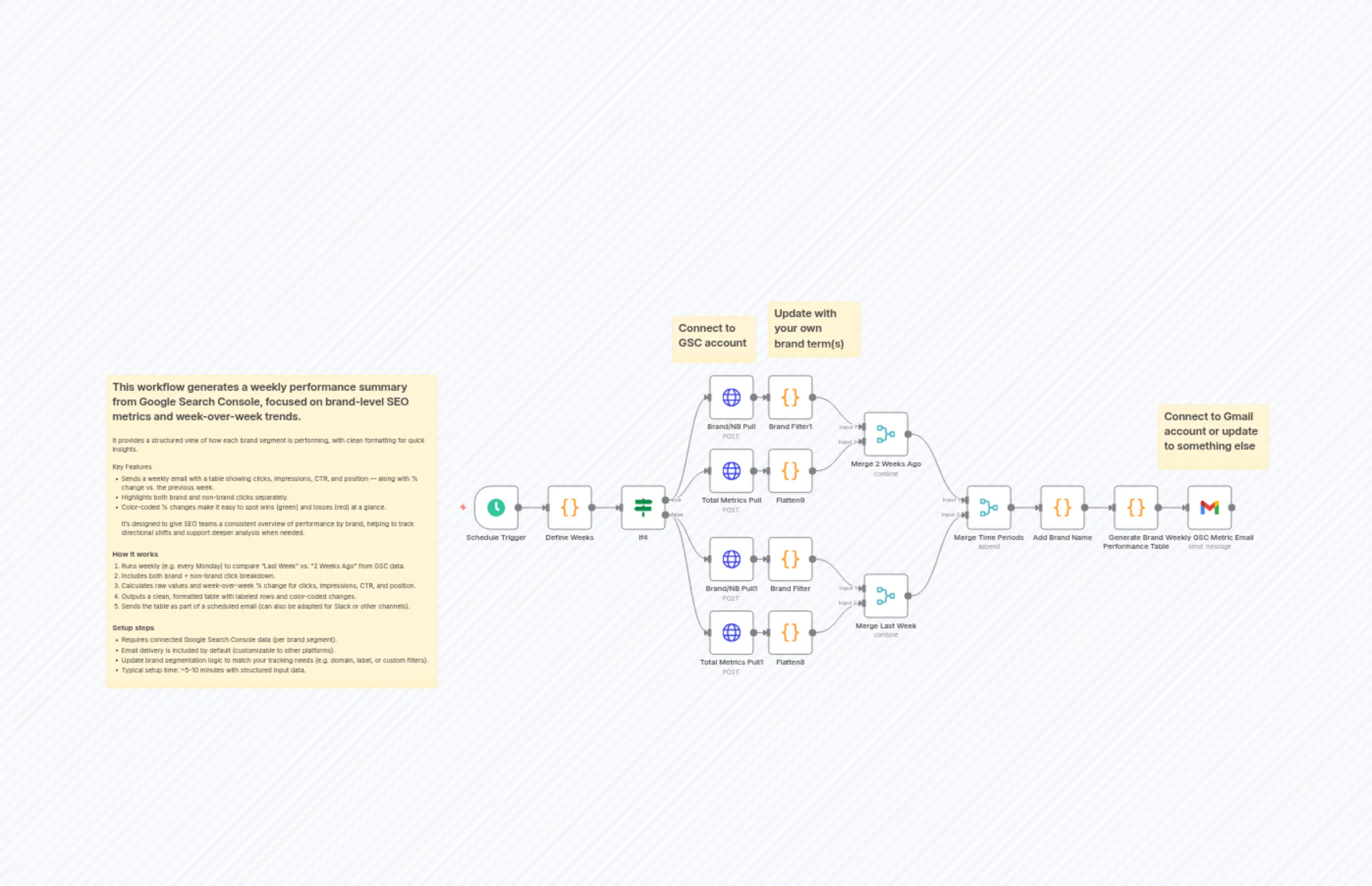"content": "## This workflow generates a weekly performance summary from Google Search Console, focused on brand-level SEO metrics and week-over-week trends.\n\nIt provides a structured view of how each brand segment is performing, with clean formatting for quick insights.\n\nKey Features\n- Sends a weekly email with a table showing clicks, impressions, CTR, and position — along with % change vs. the previous week.\n- Highlights both brand and non-brand clicks separately.\n- Color-coded % changes make it easy to spot wins (green) and losses (red) at a glance.\n\nIt’s designed to give SEO teams a consistent overview of performance by brand, helping to track directional shifts and support deeper analysis when needed.\n\n### How it works\n1. Runs weekly (e.g. every Monday) to compare “Last Week” vs. “2 Weeks Ago” from GSC data.\n2. Includes both brand + non-brand click breakdown.\n3. Calculates raw values and week-over-week % change for clicks, impressions, CTR, and position.\n4. Outputs a clean, formatted table with labeled rows and color-coded changes.\n5. Sends the table as part of a scheduled email (can also be adapted for Slack or other channels).\n\n### Setup steps\n- Requires connected Google Search Console data (per brand segment).\n- Email delivery is included by default (customizable to other platforms).\n- Update brand segmentation logic to match your tracking needs (e.g. domain, label, or custom filters).\n- Typical setup time: ~5-10 minutes with structured input data.\n"