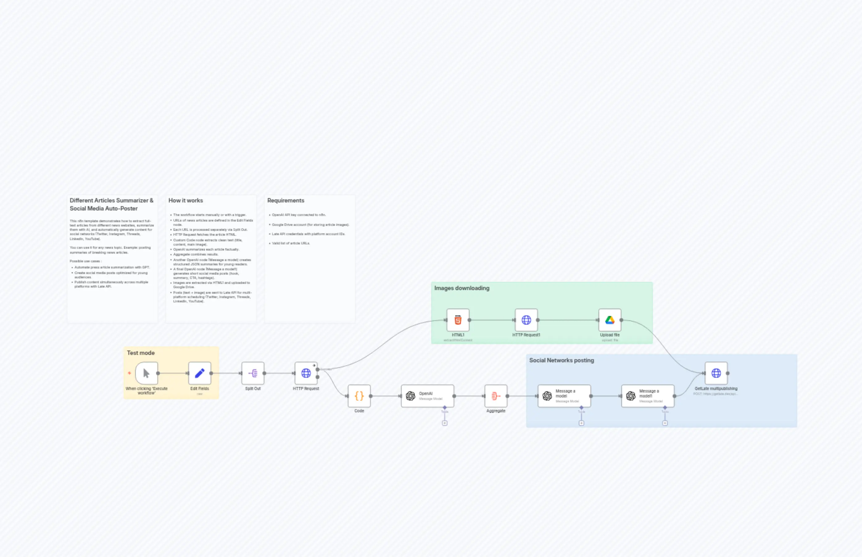 "content": "## How it works\n\n* The workflow starts manually or with a trigger.\n* URLs of news articles are defined in the Edit Fields node.\n* Each URL is processed separately via Split Out.\n* HTTP Request fetches the article HTML.\n* Custom Code node extracts clean text (title, content, main image).\n* OpenAI summarizes each article factually.\n* Aggregate combines results.\n* Another OpenAI node (Message a model) creates structured JSON summaries for young readers.\n* A final OpenAI node (Message a model1) generates short social media posts (hook, summary, CTA, hashtags).\n* Images are extracted via HTML1 and uploaded to Google Drive.\n* Posts (text + image) are sent to Late API for multi-platform scheduling (Twitter, Instagram, Threads, LinkedIn, YouTube)."