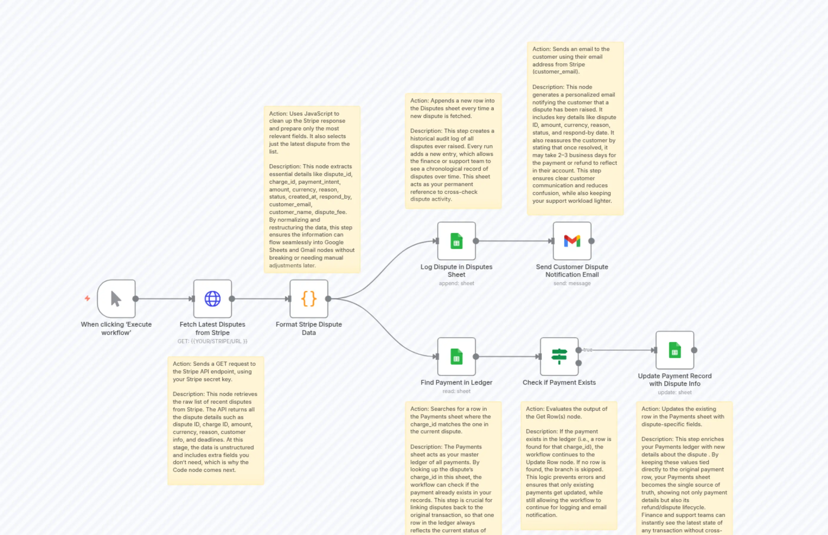 "content": "Action: Uses JavaScript to clean up the Stripe response and prepare only the most relevant fields. It also selects just the latest dispute from the list.\n\nDescription: This node extracts essential details like dispute_id, charge_id, payment_intent, amount, currency, reason, status, created_at, respond_by, customer_email, customer_name, dispute_fee. By normalizing and restructuring the data, this step ensures the information can flow seamlessly into Google Sheets and Gmail nodes without breaking or needing manual adjustments later."