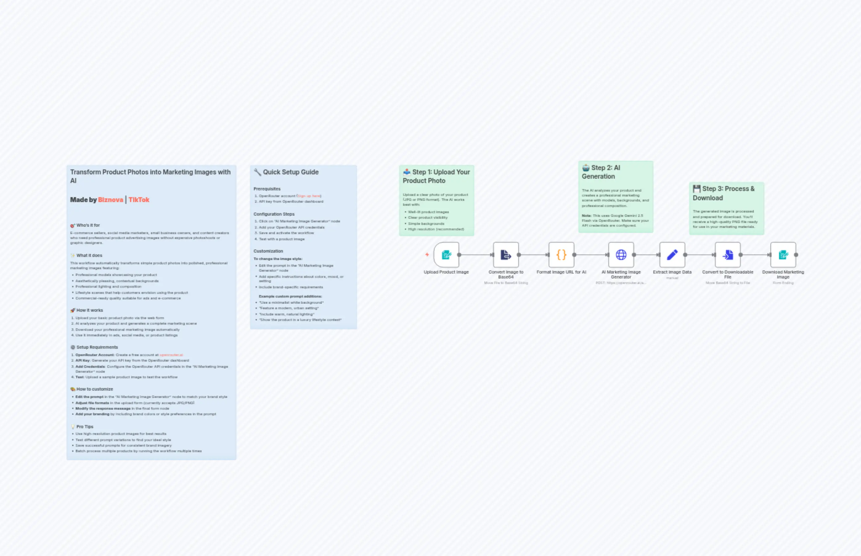 "content": "## Transform Product Photos into Marketing Images with AI\n\n**Made by [Biznova](https://www.biznova.tech/en)** | **[TikTok](https://www.tiktok.com/@biznova_tech)**\n\n---\n\n### π― Who's it for\nE-commerce sellers, social media marketers, small business owners, and content creators who need professional product advertising images without expensive photoshoots or graphic designers.\n\n### β¨ What it does\nThis workflow automatically transforms simple product photos into polished, professional marketing images featuring:\n- Professional models showcasing your product\n- Aesthetically pleasing, contextual backgrounds\n- Professional lighting and composition\n- Lifestyle scenes that help customers envision using the product\n- Commercial-ready quality suitable for ads and e-commerce\n\n### π How it works\n1. Upload your basic product photo via the web form\n2. AI analyzes your product and generates a complete marketing scene\n3. Download your professional marketing image automatically\n4. Use it immediately in ads, social media, or product listings\n\n### βοΈ Setup Requirements\n1. **OpenRouter Account**: Create a free account at [openrouter.ai](https://openrouter.ai)\n2. **API Key**: Generate your API key from the OpenRouter dashboard\n3. **Add Credentials**: Configure the OpenRouter API credentials in the \"AI Marketing Image Generator\" node\n4. **Test**: Upload a sample product image to test the workflow\n\n### π¨ How to customize\n- **Edit the prompt** in the \"AI Marketing Image Generator\" node to match your brand style\n- **Adjust file formats** in the upload form (currently accepts JPG/PNG)\n- **Modify the response message** in the final form node\n- **Add your branding** by including brand colors or style preferences in the prompt\n\n### π‘ Pro Tips\n- Use high-resolution product images for best results\n- Test different prompt variations to find your ideal style\n- Save successful prompts for consistent brand imagery\n- Batch process multiple products by running the workflow multiple times"