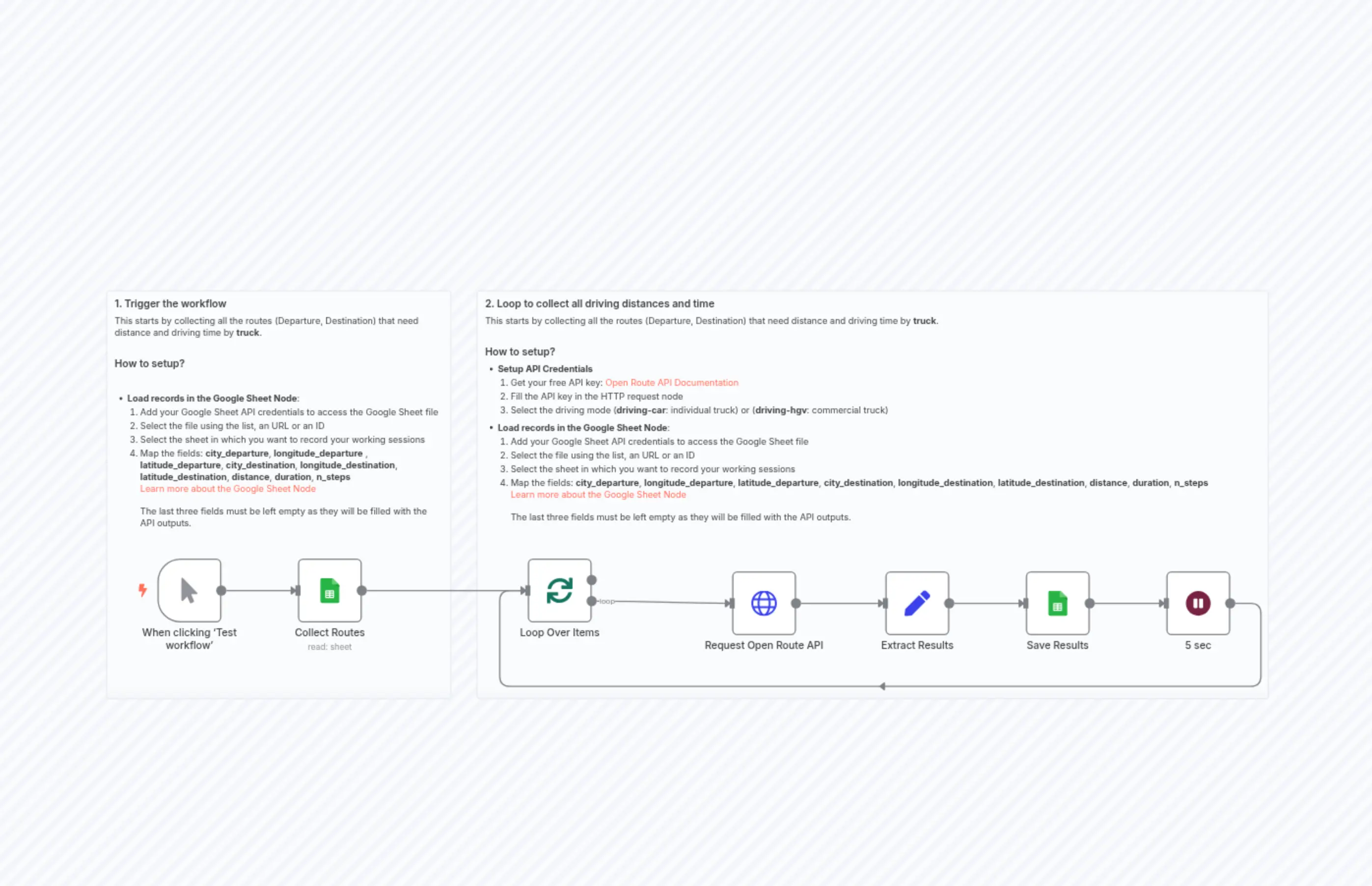 "content": "### 2. Loop to collect all driving distances and time \nThis starts by collecting all the routes (Departure, Destination) that need distance and driving time by **truck**.\n\n#### How to setup?\n- **Setup API Credentials**\n 1. Get your free API key: [Open Route API Documentation](https://openrouteservice.org/dev/#/api-docs)\n 2. Fill the API key in the HTTP request node\n 3. Select the driving mode (**driving-car**: individual truck) or (**driving-hgv**: commercial truck)\n- **Load records in the Google Sheet Node**:\n 1. Add your Google Sheet API credentials to access the Google Sheet file\n 2. Select the file using the list, an URL or an ID\n 3. Select the sheet in which you want to record your working sessions\n 4. Map the fields: **city_departure**, **longitude_departure**, **latitude_departure**, **city_destination**, **longitude_destination**, **latitude_destination**, **distance**, **duration**, **n_steps**\n [Learn more about the Google Sheet Node](https://docs.n8n.io/integrations/builtin/app-nodes/n8n-nodes-base.googlesheets)\n\nThe last three fields must be left empty as they will be filled with the API outputs.\n"