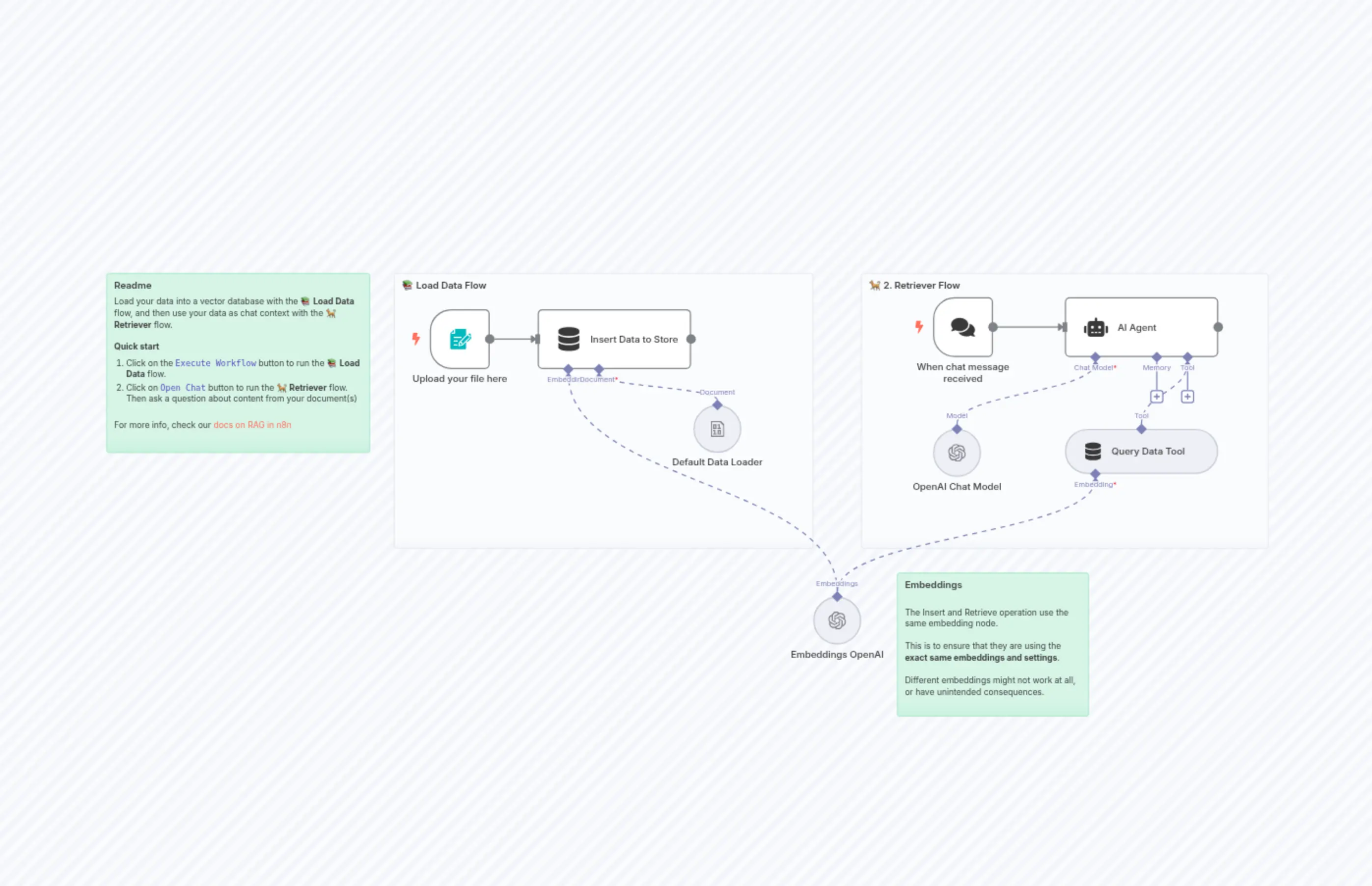 "content": "### Readme\nLoad your data into a vector database with the 📚 **Load Data** flow, and then use your data as chat context with the 🐕 **Retriever** flow.\n\n**Quick start**\n1. Click on the `Execute Workflow` button to run the 📚 **Load Data** flow.\n2. Click on `Open Chat` button to run the 🐕 **Retriever** flow. Then ask a question about content from your document(s)\n\n\nFor more info, check our [docs on RAG in n8n](https://docs.n8n.io/advanced-ai/rag-in-n8n/)"