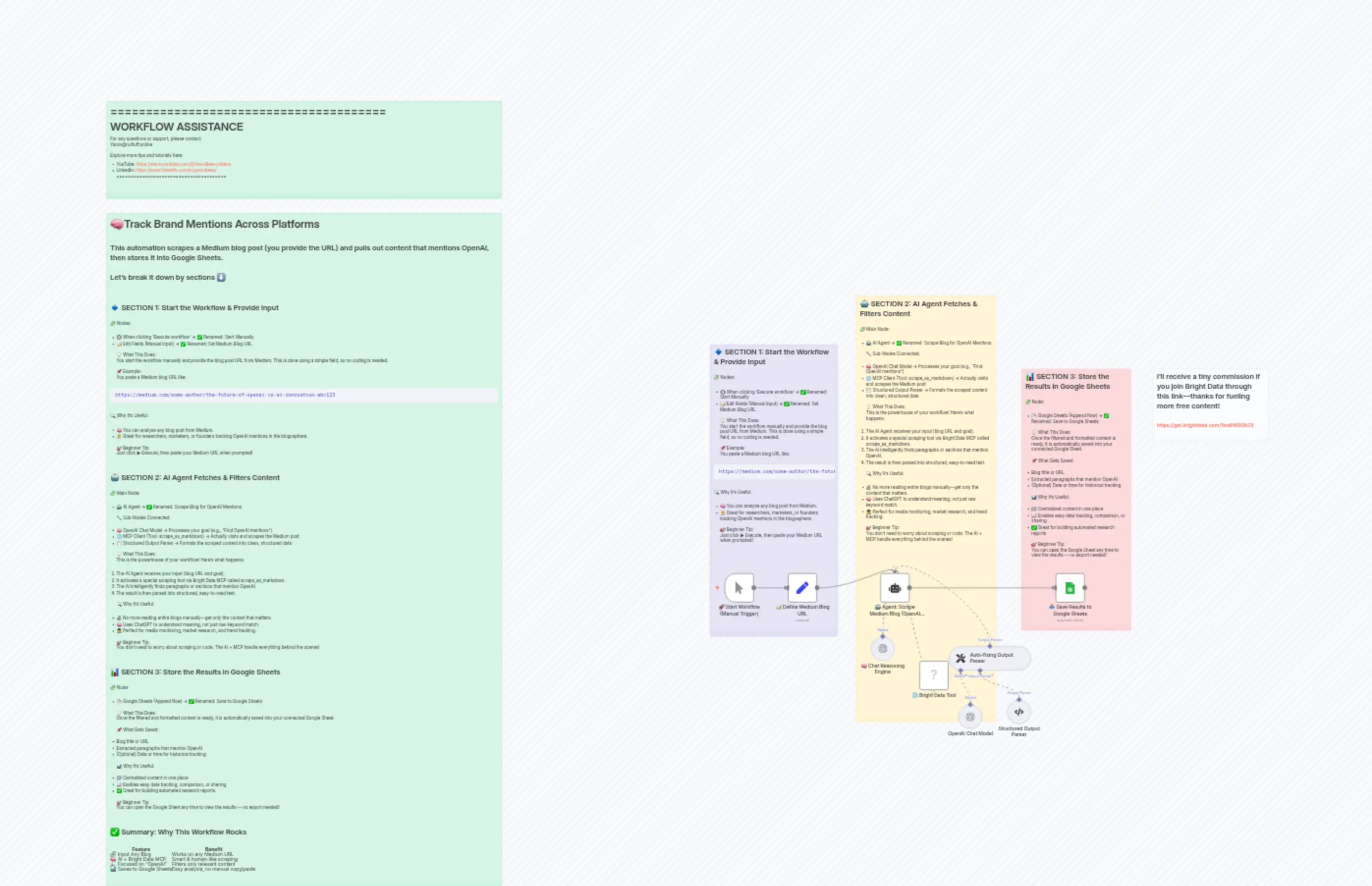 Renamed: Scrape Blog for OpenAI Mentions\n\nπ§ Sub-Nodes Connected:\n\n* π§ OpenAI Chat Model β Processes your goal (e.g., βFind OpenAI mentionsβ)\n* π MCP Client (Tool: scrape\\_as\\_markdown) β Actually visits and scrapes the Medium post\n* π§Ύ Structured Output Parser β Formats the scraped content into clean, structured data\n\nπ‘ What This Does:\nThis is the powerhouse of your workflow! Here's what happens:\n\n1. The AI Agent receives your input (blog URL and goal).\n2. It activates a special scraping tool via Bright Data MCP called scrape\\_as\\_markdown.\n3. The AI intelligently finds paragraphs or sections that mention OpenAI.\n4. The result is then parsed into structured, easy-to-read text.\n\nπ Why Itβs Useful:\n\n* π¬ No more reading entire blogs manuallyβget only the content that matters.\n* π§ Uses ChatGPT to understand meaning, not just raw keyword match.\n* π΅οΈ Perfect for media monitoring, market research, and trend tracking.\n\nπ― Beginner Tip:\nYou donβt need to worry about scraping or code. The AI + MCP handle everything behind the scenes!\n\n---\n\n## π SECTION 3: Store the Results in Google Sheets\n\nπ§© Node:\n\n* π Google Sheets (Append Row) β β
