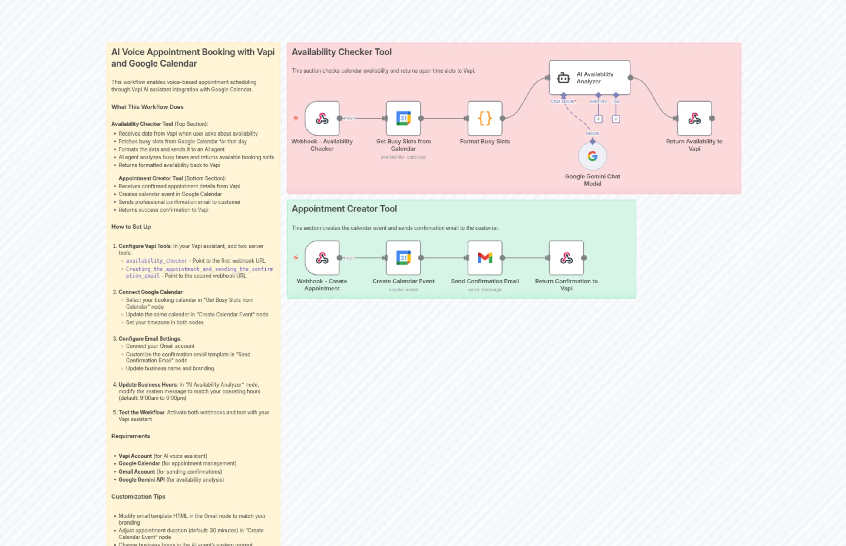 "content": "## AI Voice Appointment Booking with Vapi and Google Calendar\n\nThis workflow enables voice-based appointment scheduling through Vapi AI assistant integration with Google Calendar.\n\n### What This Workflow Does\n\n**Availability Checker Tool** (Top Section):\n- Receives date from Vapi when user asks about availability\n- Fetches busy slots from Google Calendar for that day\n- Formats the data and sends it to an AI agent\n- AI agent analyzes busy times and returns available booking slots\n- Returns formatted availability back to Vapi\n\n**Appointment Creator Tool** (Bottom Section):\n- Receives confirmed appointment details from Vapi\n- Creates calendar event in Google Calendar\n- Sends professional confirmation email to customer\n- Returns success confirmation to Vapi\n\n### How to Set Up\n\n1. **Configure Vapi Tools**: In your Vapi assistant, add two server tools:\n - `availability_checker` - Point to the first webhook URL\n - `Creating_the_appointment_and_sending_the_confirmation_email` - Point to the second webhook URL\n\n2. **Connect Google Calendar**: \n - Select your booking calendar in \"Get Busy Slots from Calendar\" node\n - Update the same calendar in \"Create Calendar Event\" node\n - Set your timezone in both nodes\n\n3. **Configure Email Settings**:\n - Connect your Gmail account\n - Customize the confirmation email template in \"Send Confirmation Email\" node\n - Update business name and branding\n\n4. **Update Business Hours**: In \"AI Availability Analyzer\" node, modify the system message to match your operating hours (default: 9:00am to 6:00pm)\n\n5. **Test the Workflow**: Activate both webhooks and test with your Vapi assistant\n\n### Requirements\n\n- **Vapi Account** (for AI voice assistant)\n- **Google Calendar** (for appointment management)\n- **Gmail Account** (for sending confirmations)\n- **Google Gemini API** (for availability analysis)\n\n### Customization Tips\n\n- Modify email template HTML in the Gmail node to match your branding\n- Adjust appointment duration (default: 30 minutes) in \"Create Calendar Event\" node\n- Change business hours in the AI agent's system prompt\n- Update timezone to match your location"