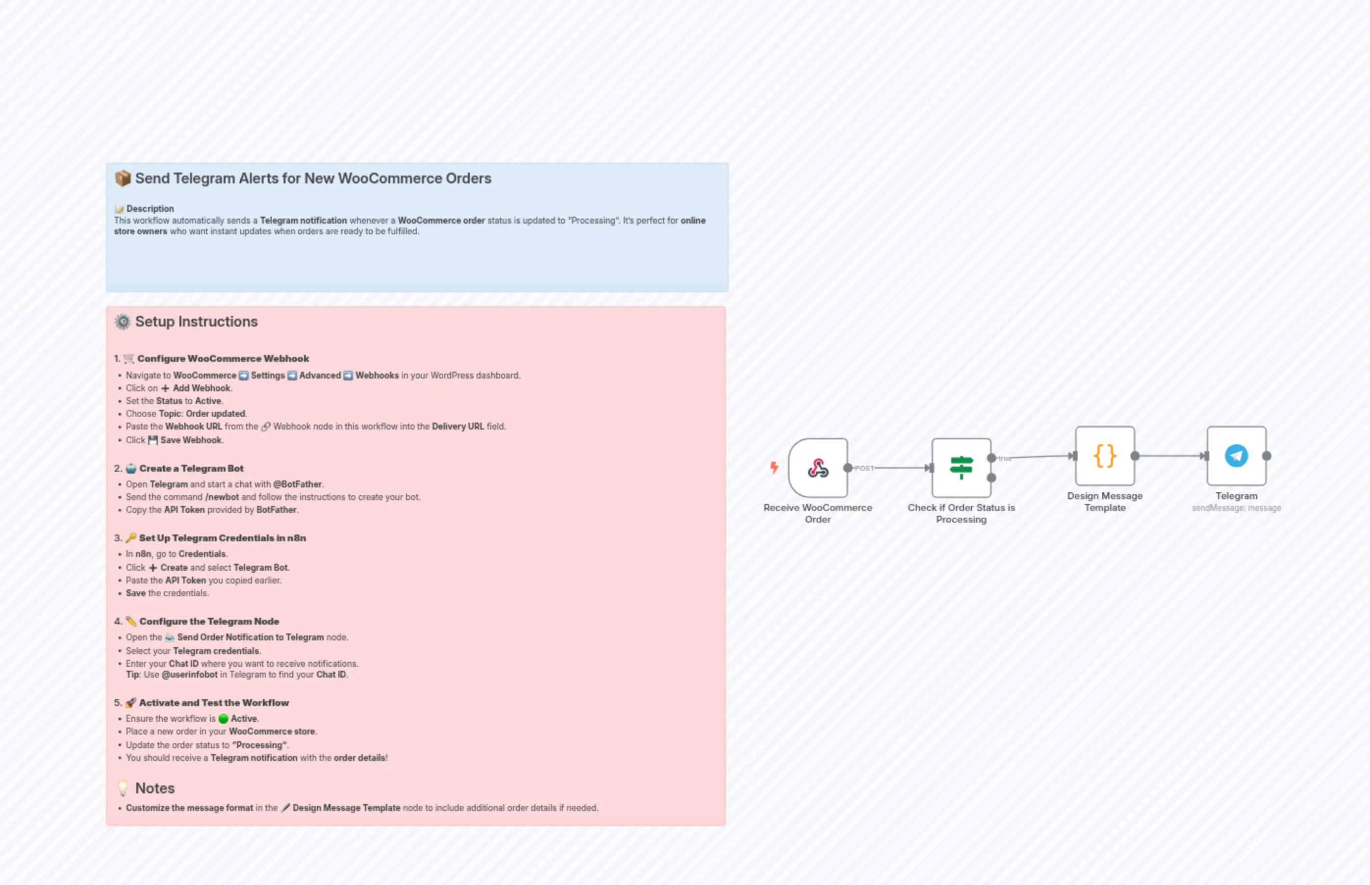 "content": "## โ๏ธ Setup Instructions\n\n### 1. ๐ **Configure WooCommerce Webhook**\n- Navigate to **WooCommerce โก๏ธ Settings โก๏ธ Advanced โก๏ธ Webhooks** in your WordPress dashboard.\n- Click on โ **Add Webhook**.\n- Set the **Status** to **Active**.\n- Choose **Topic**: **Order updated**.\n- Paste the **Webhook URL** from the ๐ Webhook node in this workflow into the **Delivery URL** field.\n- Click ๐พ **Save Webhook**.\n\n### 2. ๐ค **Create a Telegram Bot**\n- Open **Telegram** and start a chat with **@BotFather**.\n- Send the command **/newbot** and follow the instructions to create your bot.\n- Copy the **API Token** provided by **BotFather**.\n\n### 3. ๐ **Set Up Telegram Credentials in n8n**\n- In **n8n**, go to **Credentials**.\n- Click โ **Create** and select **Telegram Bot**.\n- Paste the **API Token** you copied earlier.\n- **Save** the credentials.\n\n### 4. โ๏ธ **Configure the Telegram Node**\n- Open the ๐จ **Send Order Notification to Telegram** node.\n- Select your **Telegram credentials**.\n- Enter your **Chat ID** where you want to receive notifications. \n **Tip**: Use **@userinfobot** in Telegram to find your **Chat ID**.\n\n### 5. ๐ **Activate and Test the Workflow**\n- Ensure the workflow is ๐ข **Active**.\n- Place a new order in your **WooCommerce store**.\n- Update the order status to **\"Processing\"**.\n- You should receive a **Telegram notification** with the **order details**!\n\n## ๐ก Notes\n- **Customize the message format** in the ๐๏ธ **Design Message Template** node to include additional order details if needed.\n"