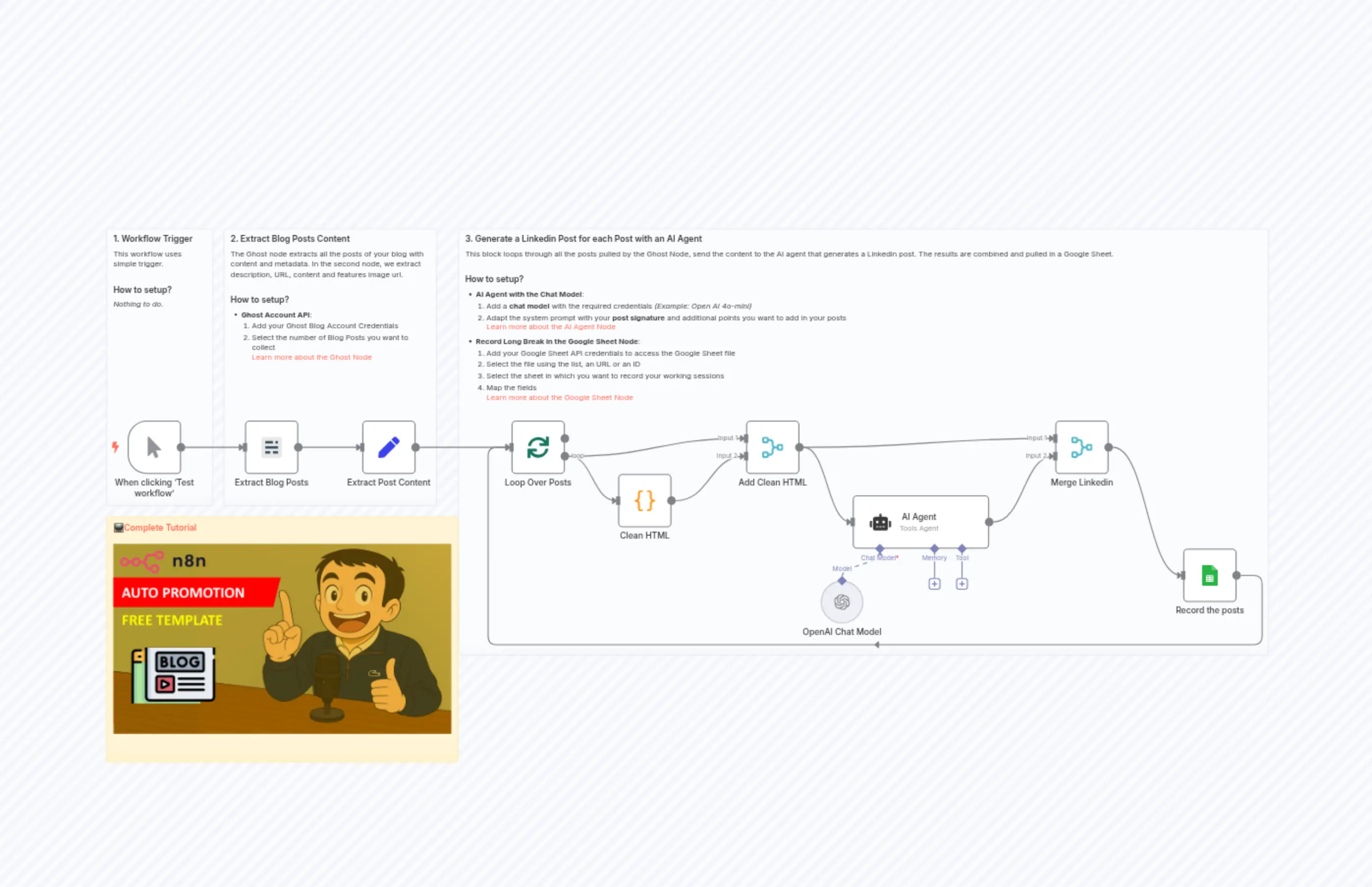 "content": "### 3. Generate a Linkedin Post for each Post with an AI Agent\nThis block loops through all the posts pulled by the Ghost Node, send the content to the AI agent that generates a Linkedin post. The results are combined and pulled in a Google Sheet.\n\n#### How to setup?\n- **AI Agent with the Chat Model**:\n 1. Add a **chat model** with the required credentials *(Example: Open AI 4o-mini)*\n 2. Adapt the system prompt with your **post signature** and additional points you want to add in your posts\n [Learn more about the AI Agent Node](https://docs.n8n.io/integrations/builtin/cluster-nodes/root-nodes/n8n-nodes-langchain.agent)\n- **Record Long Break in the Google Sheet Node**:\n 1. Add your Google Sheet API credentials to access the Google Sheet file\n 2. Select the file using the list, an URL or an ID\n 3. Select the sheet in which you want to record your working sessions\n 4. Map the fields\n [Learn more about the Google Sheet Node](https://docs.n8n.io/integrations/builtin/app-nodes/n8n-nodes-base.googlesheets)\n\n"