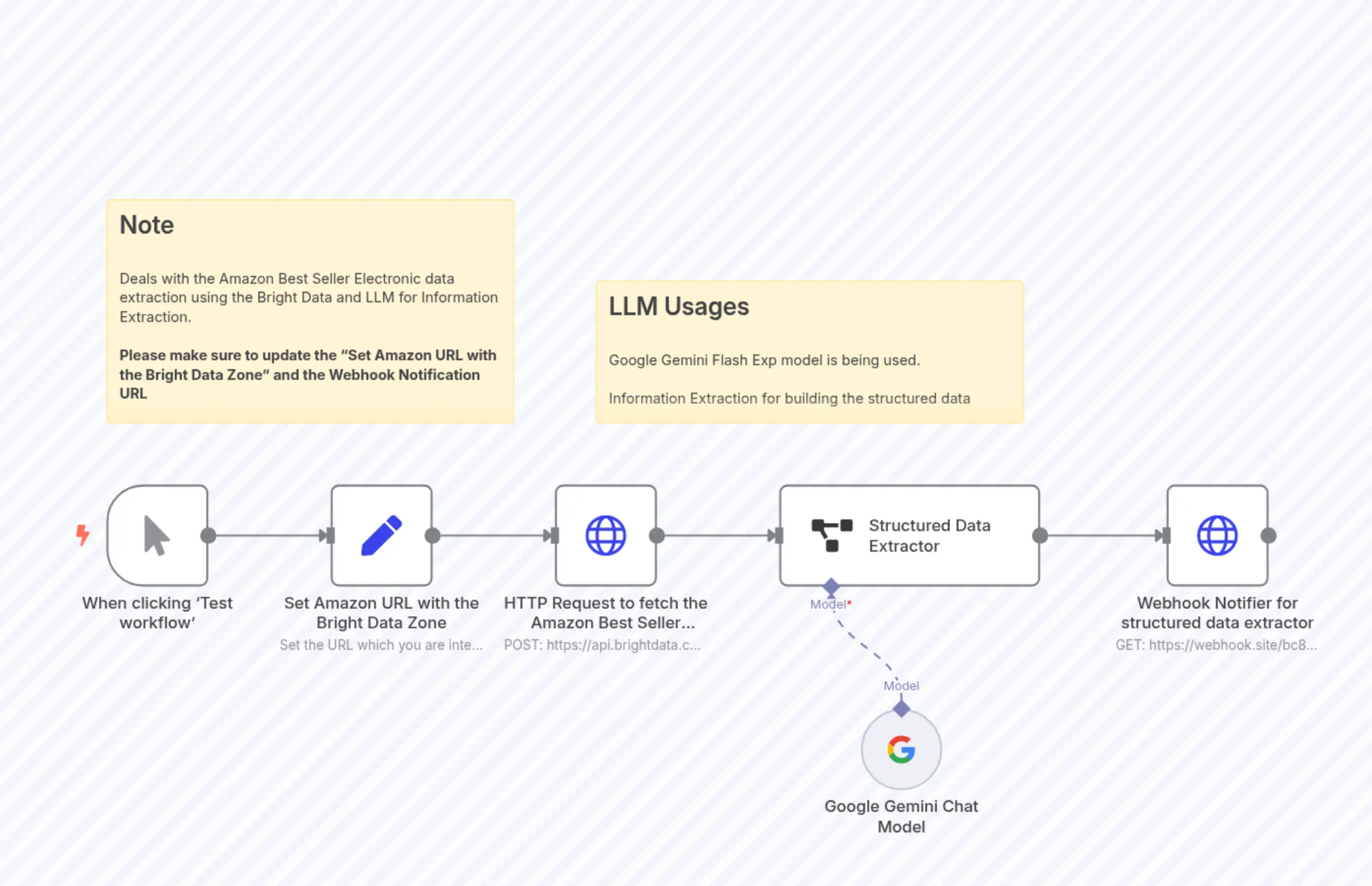 "content": "## Note\n\nDeals with the Amazon Best Seller Electronic data extraction using the Bright Data and LLM for Information Extraction.\n\n**Please make sure to update the \"Set Amazon URL with the Bright Data Zone\" and the Webhook Notification URL**"