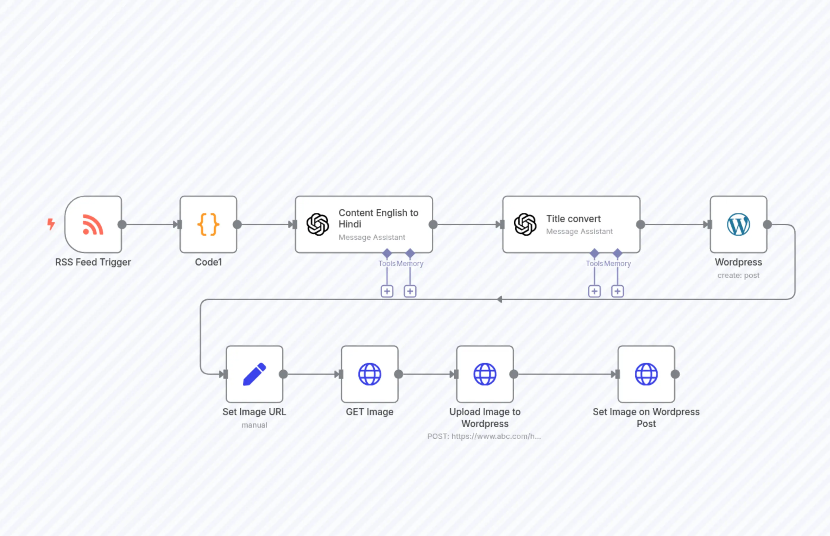 n8n-nodes-base.setn8n-nodes-base.coden8n-nodes-base.wordpressn8n-nodes-base.httpRequestn8n-nodes-base.httpRequestn8n-nodes-base.httpRequest@n8n/n8n-nodes-langchain.openAi@n8n/n8n-nodes-langchain.openAin8n-nodes-base.rssFeedReadTrigger