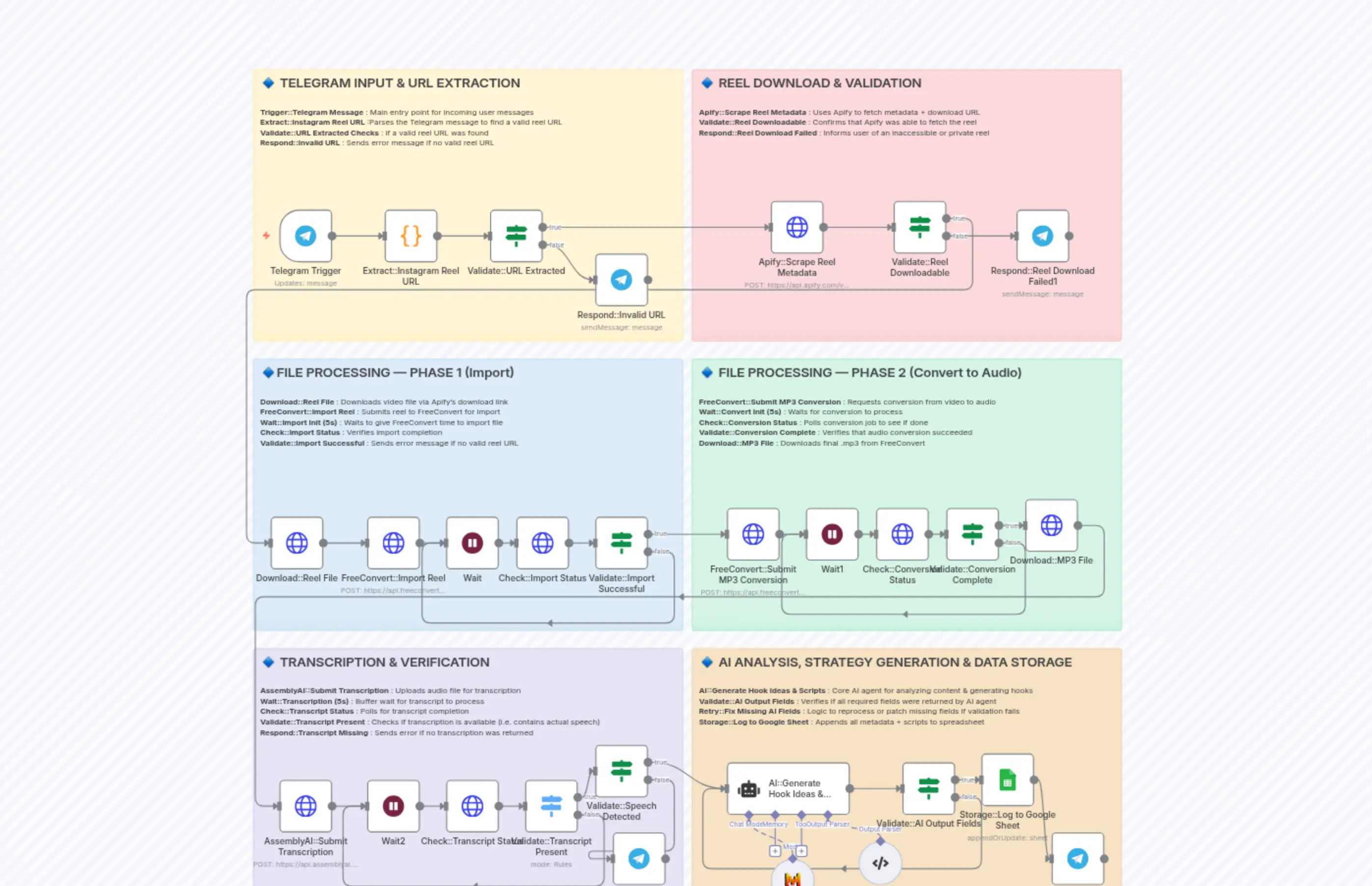 "content": "## 🔹 FILE PROCESSING — PHASE 2 (Convert to Audio)\n\n**FreeConvert::Submit MP3 Conversion** : Requests conversion from video to audio\n**Wait::Convert Init (5s)** : Waits for conversion to process\n**Check::Conversion Status** : Polls conversion job to see if done\n**Validate::Conversion Complete** : Verifies that audio conversion succeeded\n**Download::MP3 File** : Downloads final .mp3 from FreeConvert"