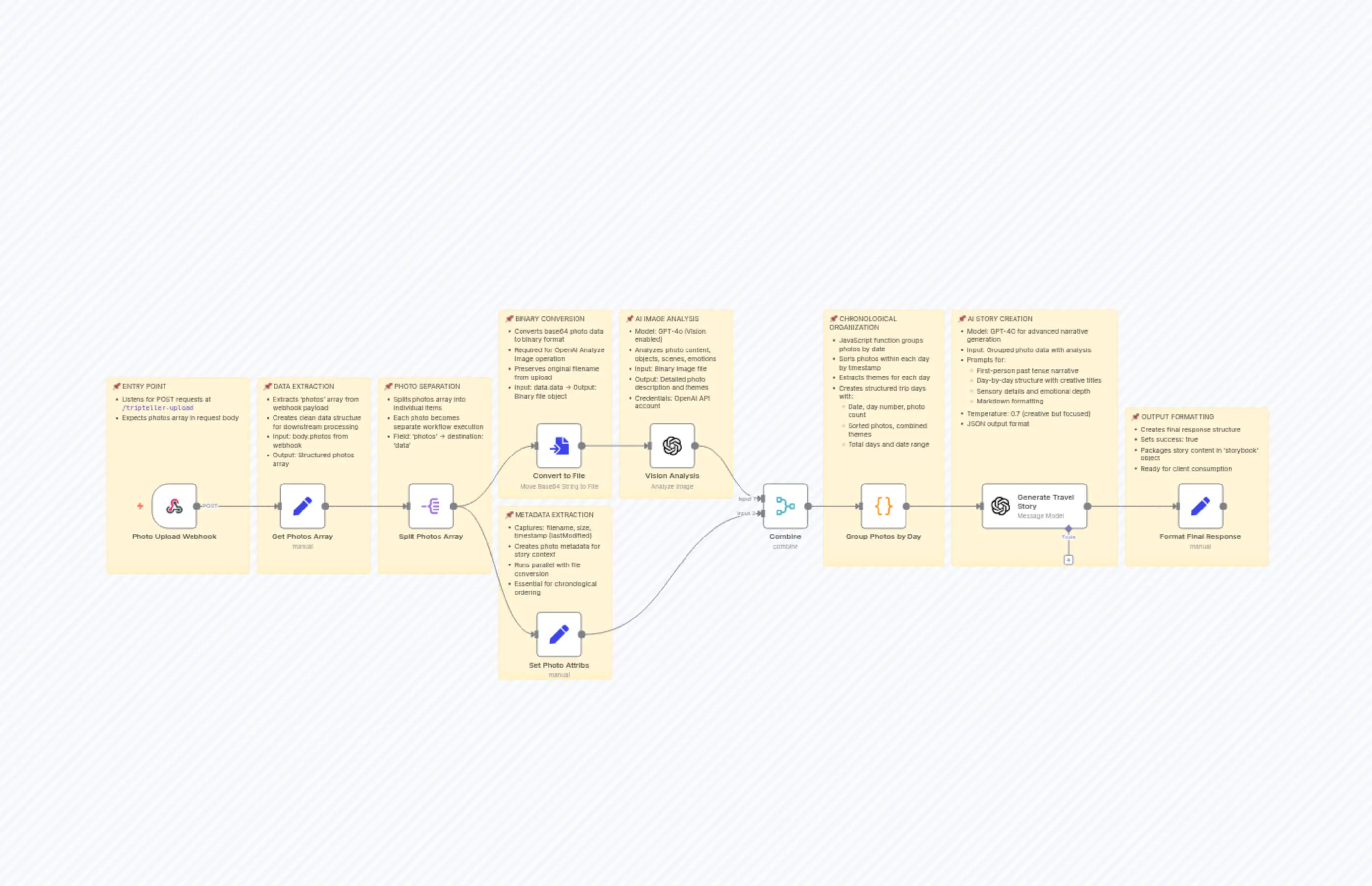 "content": "๐ ENTRY POINT\n- Listens for POST requests at `/tripteller-upload`\n- Expects photos array in request body"