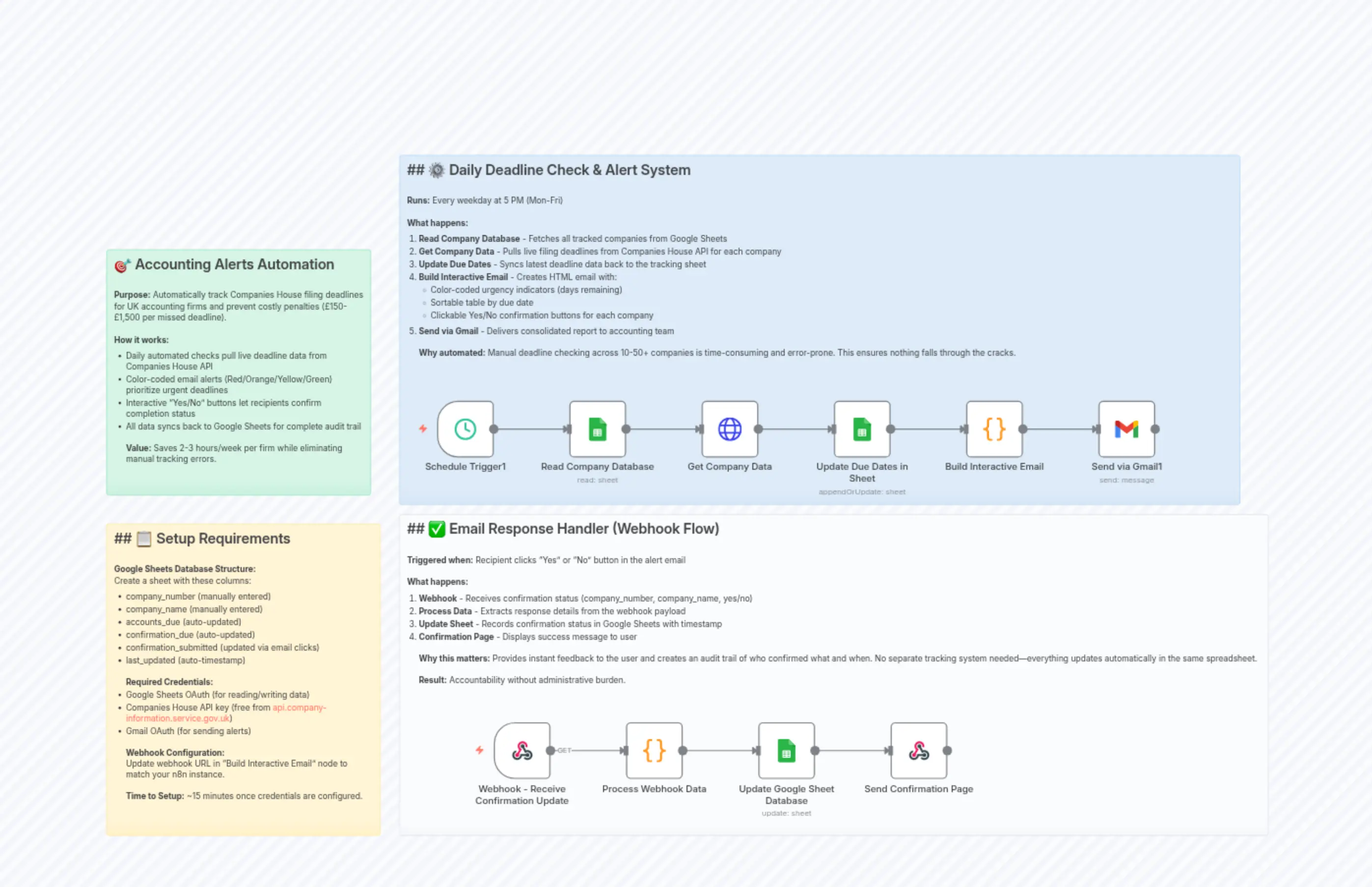 "content": "## ## 📋 Setup Requirements\n\n**Google Sheets Database Structure:**\nCreate a sheet with these columns:\n- company_number (manually entered)\n- company_name (manually entered) \n- accounts_due (auto-updated)\n- confirmation_due (auto-updated)\n- confirmation_submitted (updated via email clicks)\n- last_updated (auto-timestamp)\n\n**Required Credentials:**\n- Google Sheets OAuth (for reading/writing data)\n- Companies House API key (free from api.company-information.service.gov.uk)\n- Gmail OAuth (for sending alerts)\n\n**Webhook Configuration:**\nUpdate webhook URL in \"Build Interactive Email\" node to match your n8n instance.\n\n**Time to Setup:** ~15 minutes once credentials are configured."