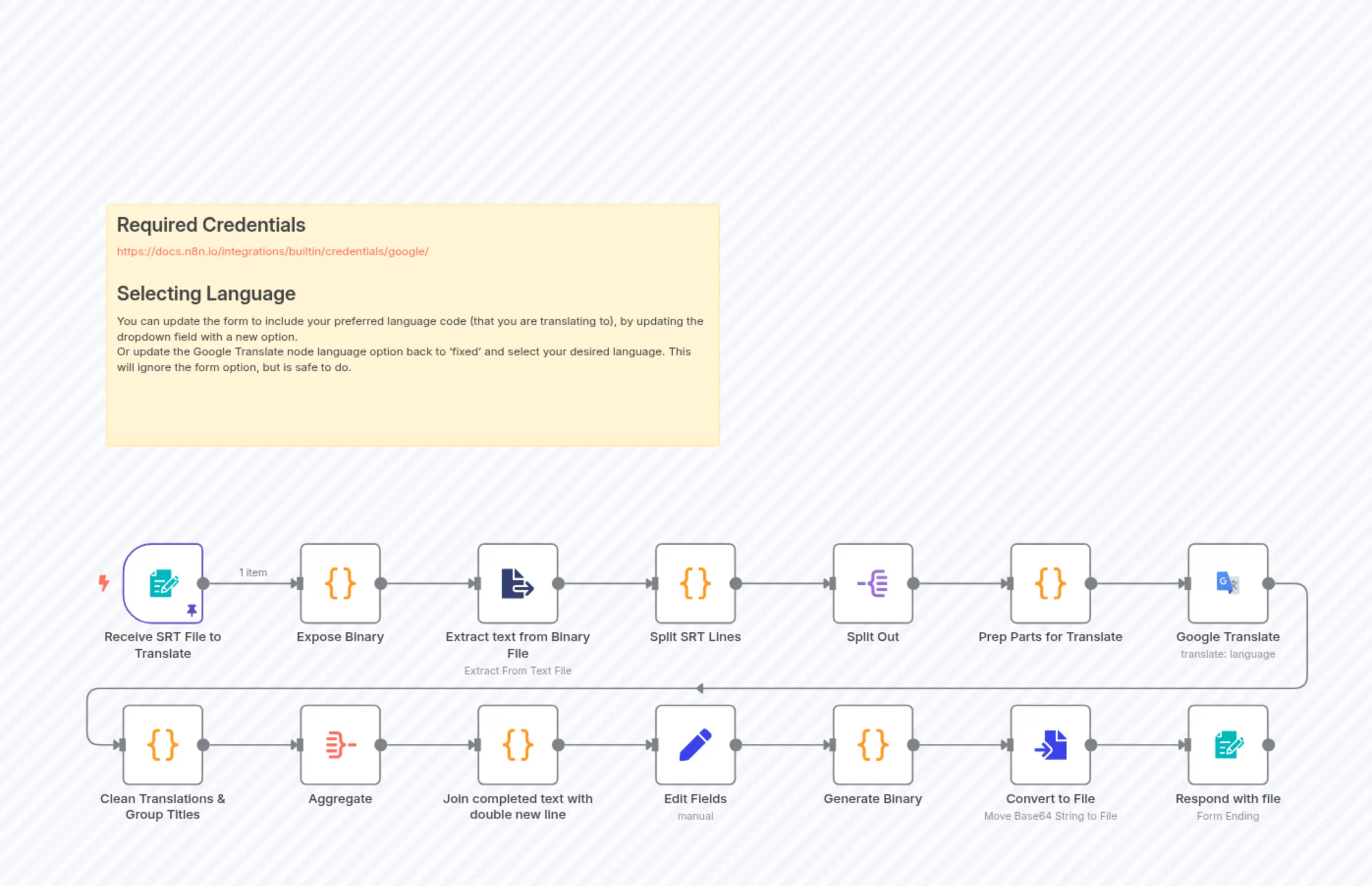 "content": "## Required Credentials\nhttps://docs.n8n.io/integrations/builtin/credentials/google/\n\n## Selecting Language\nYou can update the form to include your preferred language code (that you are translating to), by updating the dropdown field with a new option. \nOr update the Google Translate node language option back to 'fixed' and select your desired language. This will ignore the form option, but is safe to do."