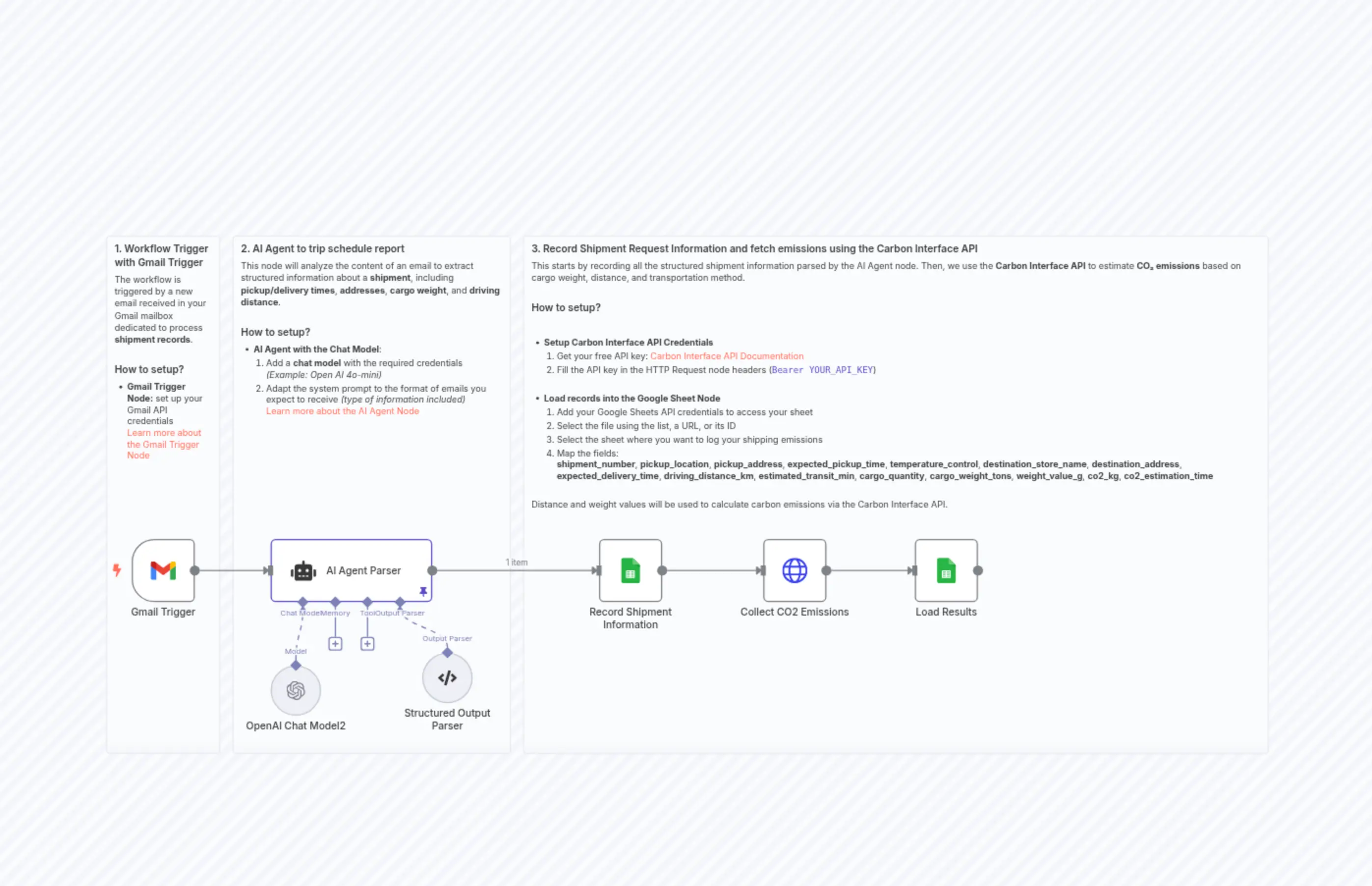 "content": "### 3. Record Shipment Request Information and fetch emissions using the Carbon Interface API \nThis starts by recording all the structured shipment information parsed by the AI Agent node. Then, we use the **Carbon Interface API** to estimate **CO₂ emissions** based on cargo weight, distance, and transportation method.\n\n#### How to setup?\n\n- **Setup Carbon Interface API Credentials** \n 1. Get your free API key: [Carbon Interface API Documentation](https://docs.carboninterface.com/#/) \n 2. Fill the API key in the HTTP Request node headers (`Bearer YOUR_API_KEY`)\n\n- **Load records into the Google Sheet Node** \n 1. Add your Google Sheets API credentials to access your sheet \n 2. Select the file using the list, a URL, or its ID \n 3. Select the sheet where you want to log your shipping emissions \n 4. Map the fields: \n **shipment_number**, **pickup_location**, **pickup_address**, **expected_pickup_time**, **temperature_control**, **destination_store_name**, **destination_address**, **expected_delivery_time**, **driving_distance_km**, **estimated_transit_min**, **cargo_quantity**, **cargo_weight_tons**, **weight_value_g**, **co2_kg**, **co2_estimation_time**\n\n> Distance and weight values will be used to calculate carbon emissions via the Carbon Interface API.\n\n"