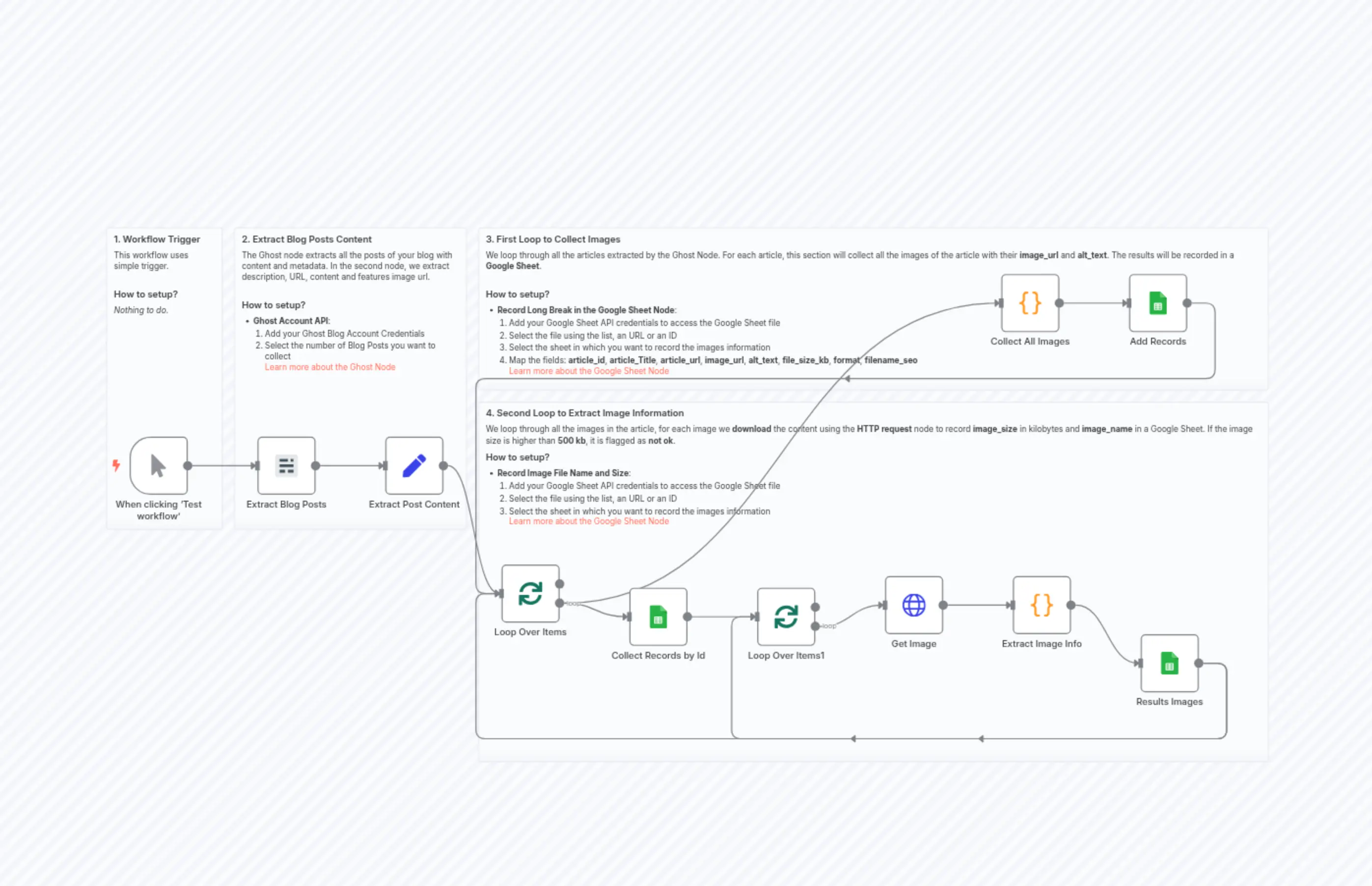 "content": "### 3. First Loop to Collect Images\nWe loop through all the articles extracted by the Ghost Node. For each article, this section will collect all the images of the article with their **image_url** and **alt_text**. The results will be recorded in a **Google Sheet**.\n\n#### How to setup?\n- **Record Long Break in the Google Sheet Node**:\n 1. Add your Google Sheet API credentials to access the Google Sheet file\n 2. Select the file using the list, an URL or an ID\n 3. Select the sheet in which you want to record the images information\n 4. Map the fields: **article_id**, **article_Title**, **article_url**, **image_url**, **alt_text**, **file_size_kb**, **format**, **filename_seo**\n [Learn more about the Google Sheet Node](https://docs.n8n.io/integrations/builtin/app-nodes/n8n-nodes-base.googlesheets)\n\n\n"