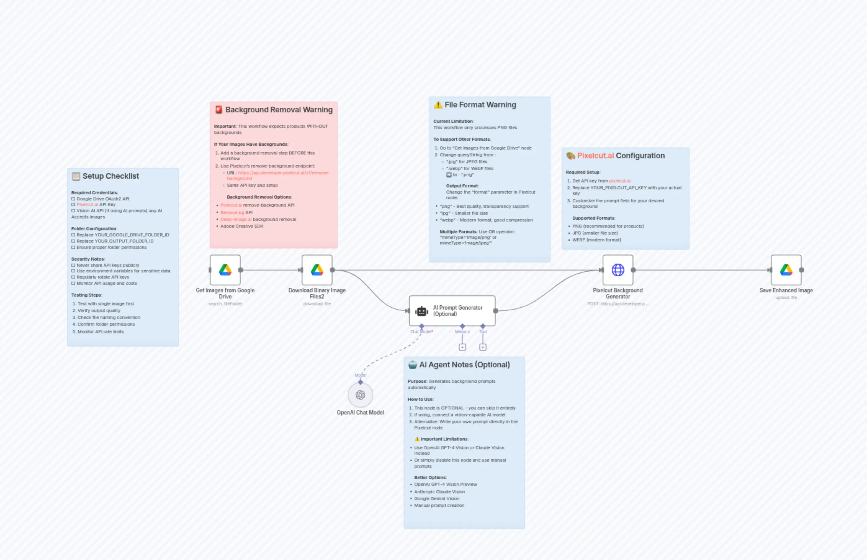 "content": "## š Setup Checklist\n\n**Required Credentials**:\nā” Google Drive OAuth2 API\nā” Pixelcut.ai API Key\nā” Vision AI API (if using AI prompts) any AI Accepts images\n\n**Folder Configuration**:\nā” Replace YOUR_GOOGLE_DRIVE_FOLDER_ID\nā” Replace YOUR_OUTPUT_FOLDER_ID\nā” Ensure proper folder permissions\n\n**Security Notes**:\nā” Never share API keys publicly\nā” Use environment variables for sensitive data\nā” Regularly rotate API keys\nā” Monitor API usage and costs\n\n**Testing Steps**:\n1. Test with single image first\n2. Verify output quality\n3. Check file naming convention\n4. Confirm folder permissions\n5. Monitor API rate limits"