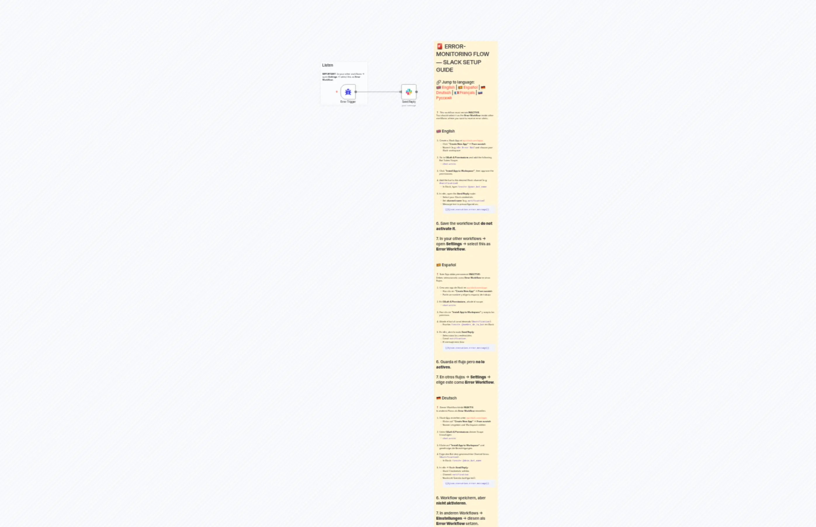 "content": "# 🚨 ERROR-MONITORING FLOW — SLACK SETUP GUIDE \n\n🔗 Jump to language: \n🇬🇧 [English](#-english) | 🇪🇸 [Español](#-español) | 🇩🇪 [Deutsch](#-deutsch) | 🇫🇷 [Français](#-français) | 🇷🇺 [Русский](#-русский) \n\n---\n\n> ❗ This workflow must remain **INACTIVE**. \n> You should select it as the **Error Workflow** inside other workflows where you want to receive error alerts.\n\n---\n\n## 🇬🇧 English\n\n1. Create a Slack App at [api.slack.com/apps](https://api.slack.com/apps) \n - Click **\"Create New App\"** → **From scratch** \n - Name it (e.g. `n8n Error Bot`) and choose your Slack workspace \n\n2. Go to **OAuth & Permissions** and add the following Bot Token Scope: \n - `chat:write`\n\n3. Click **\"Install App to Workspace\"**, then approve the permissions.\n\n4. Add the bot to the desired Slack channel (e.g. `#notification`): \n - In Slack, type `/invite @your_bot_name`\n\n5. In n8n, open the **Send Reply** node: \n - Select your Slack credentials \n - Set **channel name** (e.g. `notification`) \n - Message text is preconfigured as: \n ```\n {{$json.execution.error.message}}\n ```\n\n6. Save the workflow but **do not activate it**.\n\n7. In your other workflows → open **Settings** → select this as **Error Workflow**.\n\n---\n\n## 🇪🇸 Español\n\n> ❗ Este flujo debe permanecer **INACTIVO**. \n> Debes seleccionarlo como **Error Workflow** en otros flujos.\n\n1. Crea una app de Slack en [api.slack.com/apps](https://api.slack.com/apps) \n - Haz clic en **\"Create New App\"** → **From scratch** \n - Ponle un nombre y elige tu espacio de trabajo \n\n2. En **OAuth & Permissions**, añade el scope: \n - `chat:write`\n\n3. Haz clic en **\"Install App to Workspace\"** y acepta los permisos.\n\n4. Añade el bot al canal deseado (`#notification`): \n - Escribe `/invite @nombre_de_tu_bot` en Slack\n\n5. En n8n, abre la nodo **Send Reply**: \n - Selecciona las credenciales \n - Canal: `notification` \n - El mensaje está listo: \n ```\n {{$json.execution.error.message}}\n ```\n\n6. Guarda el flujo pero **no lo actives**.\n\n7. En otros flujos → **Settings** → elige este como **Error Workflow**.\n\n---\n\n## 🇩🇪 Deutsch\n\n> ❗ Dieser Workflow bleibt **INAKTIV**. \n> In anderen Flows als **Error Workflow** einstellen.\n\n1. Slack-App erstellen unter [api.slack.com/apps](https://api.slack.com/apps) \n - Klicke auf **\"Create New App\"** → **From scratch** \n - Namen vergeben und Workspace wählen \n\n2. Unter **OAuth & Permissions** diesen Scope hinzufügen: \n - `chat:write`\n\n3. Klicke auf **\"Install App to Workspace\"** und genehmige die Berechtigungen.\n\n4. Füge den Bot dem gewünschten Channel hinzu (`#notification`): \n - In Slack: `/invite @dein_bot_name`\n\n5. In n8n → Node **Send Reply**: \n - Slack-Credentials wählen \n - Channel: `notification` \n - Nachricht (bereits konfiguriert): \n ```\n {{$json.execution.error.message}}\n ```\n\n6. Workflow speichern, aber **nicht aktivieren**.\n\n7. In anderen Workflows → **Einstellungen** → diesen als **Error Workflow** setzen.\n\n---\n\n## 🇫🇷 Français\n\n> ❗ Ce flux reste **INACTIF**. \n> À sélectionner comme **Error Workflow** dans d'autres workflows.\n\n1. Créez une application Slack sur [api.slack.com/apps](https://api.slack.com/apps) \n - Cliquez sur **\"Create New App\"** → **From scratch** \n - Nommez-la et choisissez l’espace de travail \n\n2. Allez dans **OAuth & Permissions** et ajoutez : \n - `chat:write`\n\n3. Cliquez sur **\"Install App to Workspace\"** et autorisez les accès.\n\n4. Ajoutez le bot dans le canal (`#notification`) : \n - Tapez `/invite @nom_du_bot` dans Slack\n\n5. Dans n8n → nœud **Send Reply** : \n - Sélectionnez les identifiants Slack \n - Canal : `notification` \n - Message : \n ```\n {{$json.execution.error.message}}\n ```\n\n6. Sauvegardez ce workflow mais **ne l’activez pas**.\n\n7. Dans d'autres workflows → **Paramètres** → définissez ce flux comme **Error Workflow**.\n\n---\n\n## 🇷🇺 Русский\n\n> ❗ Этот workflow должен быть **НЕАКТИВНЫМ**. \n> Его нужно выбрать в настройках других workflow как **Error Workflow**.\n\n1. Создайте Slack-приложение: [api.slack.com/apps](https://api.slack.com/apps) \n - Нажмите **\"Create New App\"** → **From scratch** \n - Назовите и выберите рабочее пространство \n\n2. Перейдите в **OAuth & Permissions** и добавьте scope: \n - `chat:write`\n\n3. Нажмите **\"Install App to Workspace\"** и подтвердите права доступа.\n\n4. Добавьте бота в нужный канал (`#notification`): \n - В Slack напишите `/invite @имя_бота`\n\n5. В n8n → откройте ноду **Send Reply**: \n - Выберите Slack credentials \n - Укажите канал: `notification` \n - Текст сообщения по умолчанию: \n ```\n {{$json.execution.error.message}}\n ```\n\n6. Сохраните workflow, но **не активируйте его**.\n\n7. В других workflow → **Настройки** → выберите этот как **Error Workflow**."