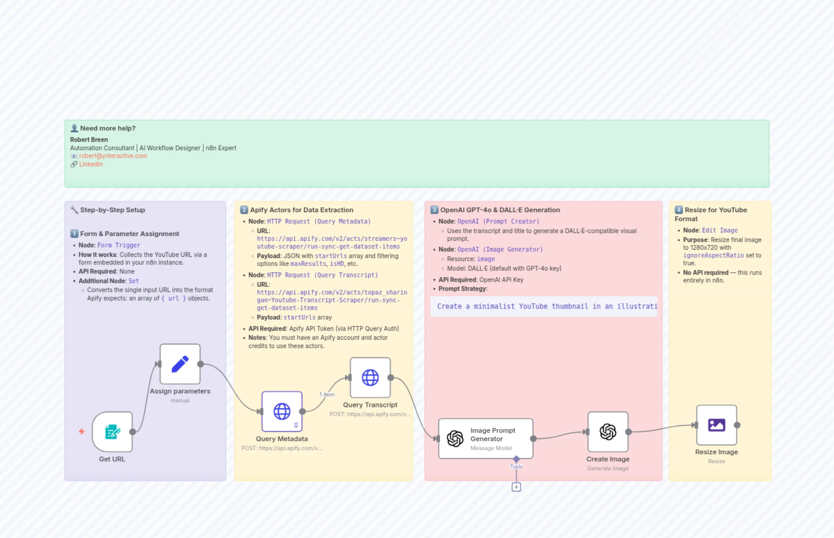 "content": "### 👤 Need more help? \n**Robert Breen** \nAutomation Consultant | AI Workflow Designer | n8n Expert \n📧 [[email protected]](mailto:[email protected]) \n🔗 [LinkedIn](https://www.linkedin.com/in/robert-breen-29429625/)"
