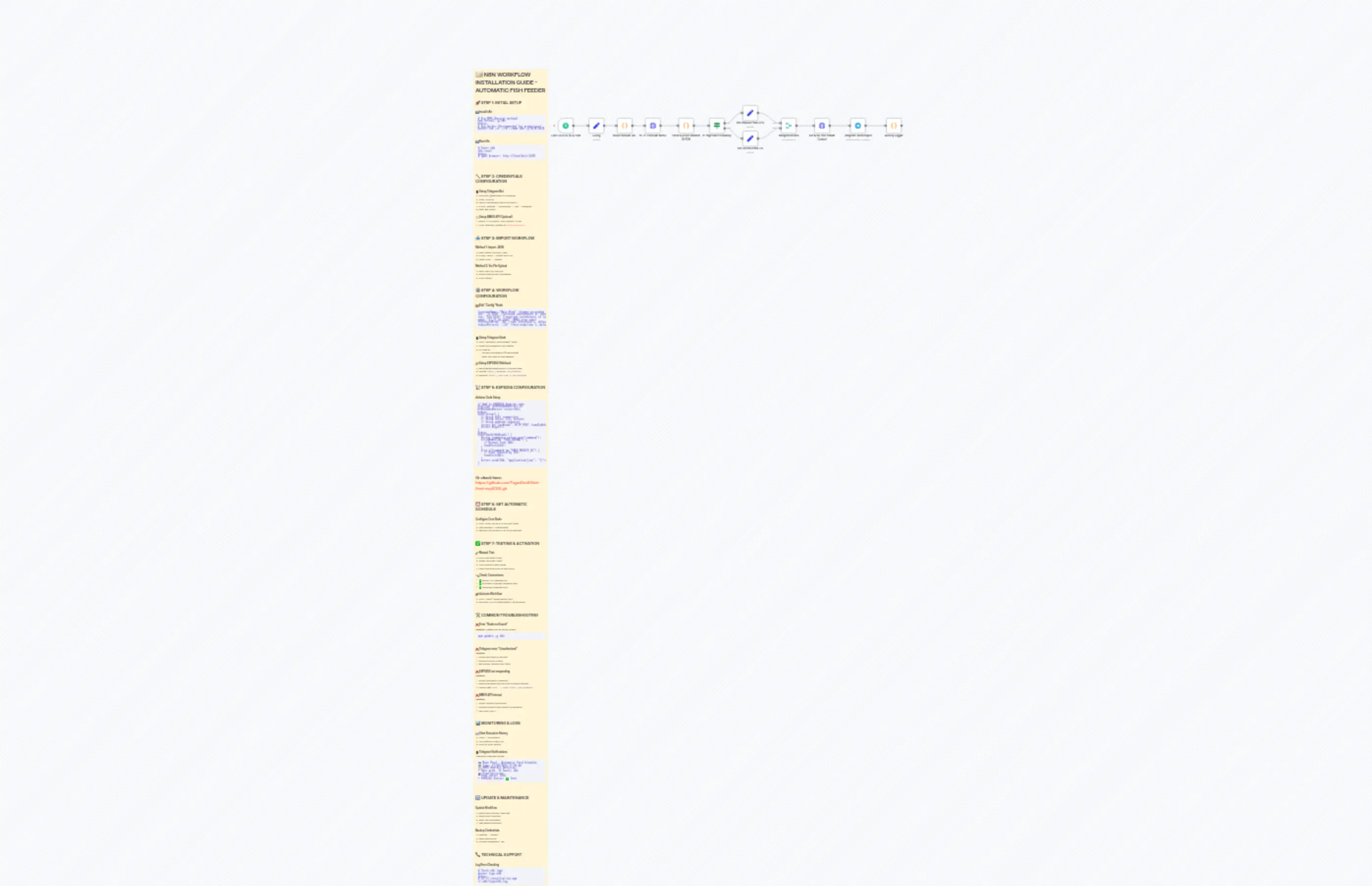 Telegram message sent\n\n### π Activate Workflow\n1. Click \"Active\" toggle at top right\n2. Workflow will run automatically on schedule\n\n---\n\n## π οΈ COMMON TROUBLESHOOTING\n\n### β Error \"Node not found\"\n**Solution:** Update n8n to latest version\n```bash\nnpm update -g n8n\n```\n\n### β Telegram error \"Unauthorized\"\n**Solution:** \n- Check Bot Token is correct\n- Ensure Chat ID is valid\n- Bot already started with /start\n\n### β ESP8266 not responding\n**Solution:**\n- Check ESP8266 IP address\n- Ensure ESP8266 and n8n are on same network \n- Manual test: `curl -X POST http://IP/webhook`\n\n### β BMKG API timeout\n**Solution:**\n- Check internet connection\n- Change timeout from 30000 to 60000ms\n- Use valid ADM4\n\n---\n\n## π MONITORING & LOGS\n\n### π View Execution History\n1. Menu β Executions\n2. View status of each run\n3. Click for error details\n\n### π± Telegram Notifications \nAutomatic message format:\n```\nπ Main Pond - Automatic Feed Schedule\nπ