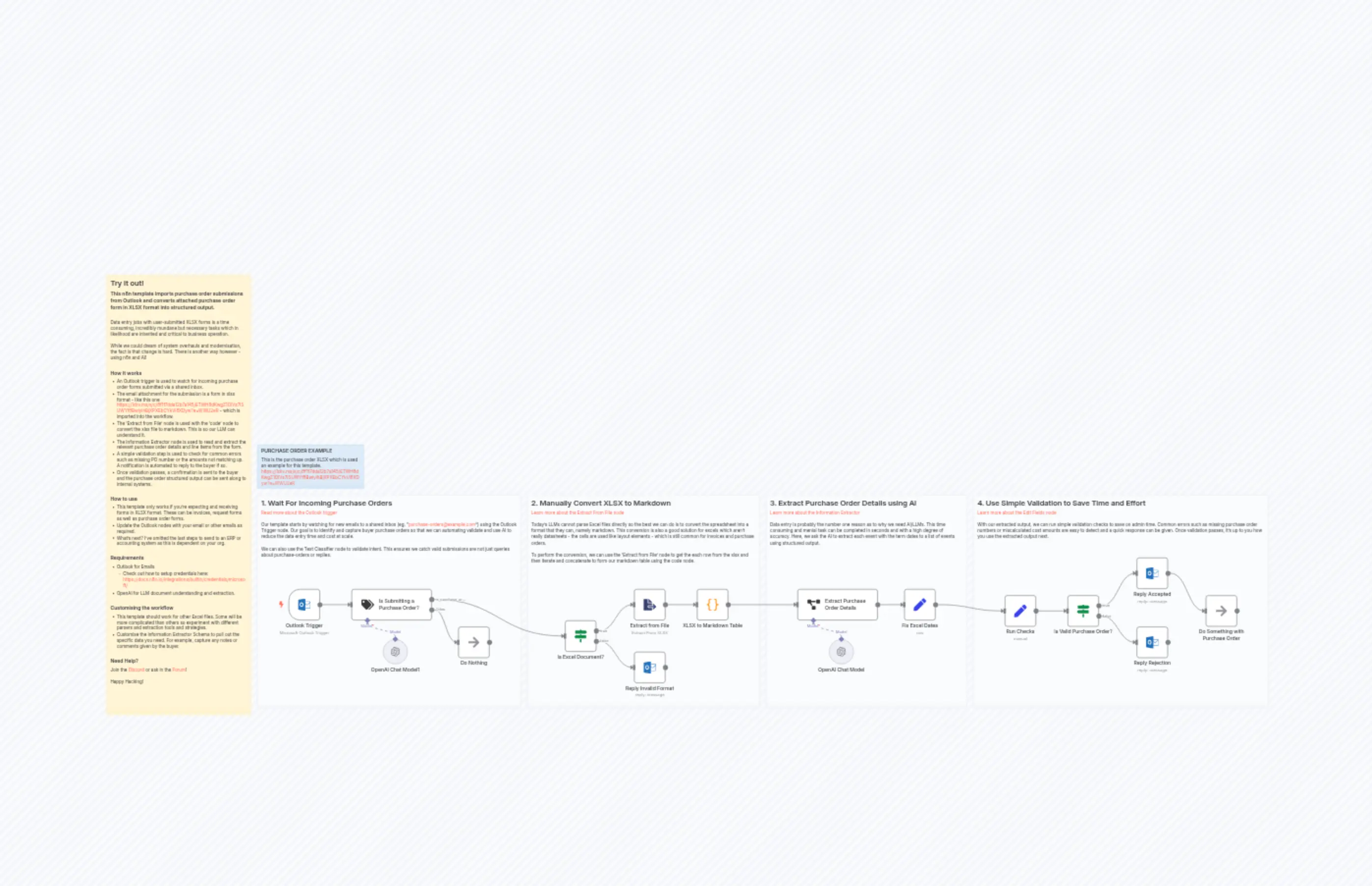 "content": "## Try it out!\n### This n8n template imports purchase order submissions from Outlook and converts attached purchase order form in XLSX format into structured output.\n\nData entry jobs with user-submitted XLSX forms is a time consuming, incredibly mundane but necessary tasks which in likelihood are inherited and critical to business operation.\n\nWhile we could dream of system overhauls and modernisation, the fact is that change is hard. There is another way however - using n8n and AI!\n\n### How it works\n* An Outlook trigger is used to watch for incoming purchase order forms submitted via a shared inbox.\n* The email attachment for the submission is a form in xlsx format - like this one https://1drv.ms/x/c/8f1f7dda12b7a145/ETWH8dKwgZ1OiVz7ISUWYf8BwiyihBjXPXEbCYkVi8XDyw?e=WWU2eR - which is imported into the workflow.\n* The 'Extract from File' node is used with the 'code' node to convert the xlsx file to markdown. This is so our LLM can understand it.\n* The Information Extractor node is used to read and extract the relevant purchase order details and line items from the form.\n* A simple validation step is used to check for common errors such as missing PO number or the amounts not matching up. A notification is automated to reply to the buyer if so.\n* Once validation passes, a confirmation is sent to the buyer and the purchase order structured output can be sent along to internal systems.\n\n### How to use\n* This template only works if you're expecting and receiving forms in XLSX format. These can be invoices, request forms as well as purchase order forms.\n* Update the Outlook nodes with your email or other emails as required.\n* What's next? I've omitted the last steps to send to an ERP or accounting system as this is dependent on your org.\n\n### Requirements\n* Outlook for Emails\n * Check out how to setup credentials here: https://docs.n8n.io/integrations/builtin/credentials/microsoft/\n* OpenAI for LLM document understanding and extraction.\n\n### Customising the workflow\n* This template should work for other Excel files. Some will be more complicated than others so experiment with different parsers and extraction tools and strategies.\n* Customise the Information Extractor Schema to pull out the specific data you need. For example, capture any notes or comments given by the buyer.\n\n### Need Help?\nJoin the [Discord](https://discord.com/invite/XPKeKXeB7d) or ask in the [Forum](https://community.n8n.io/)!\n\nHappy Hacking!"